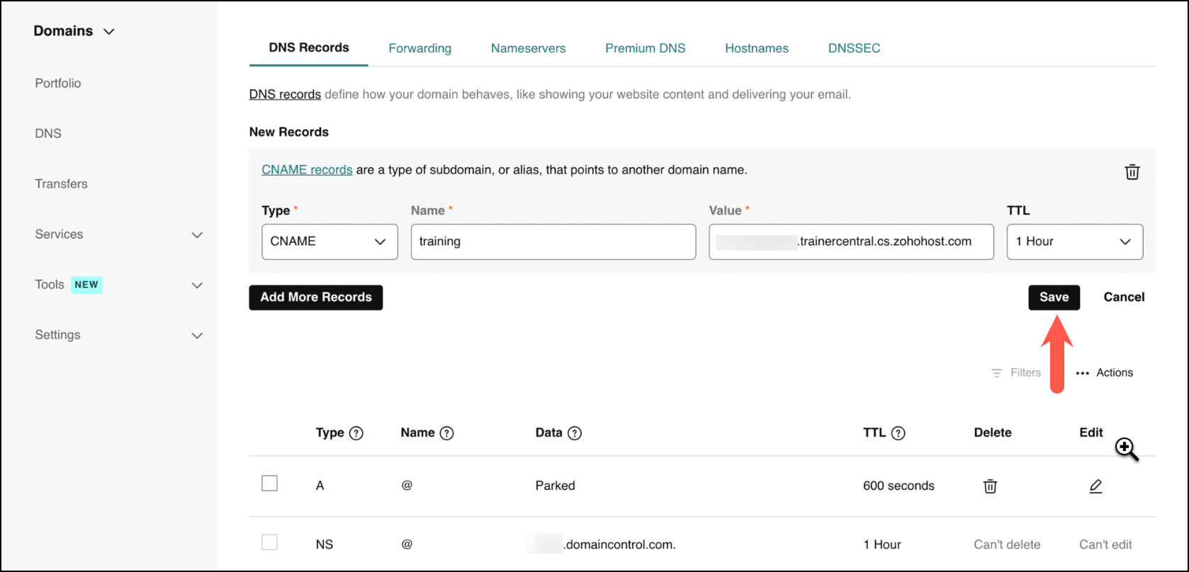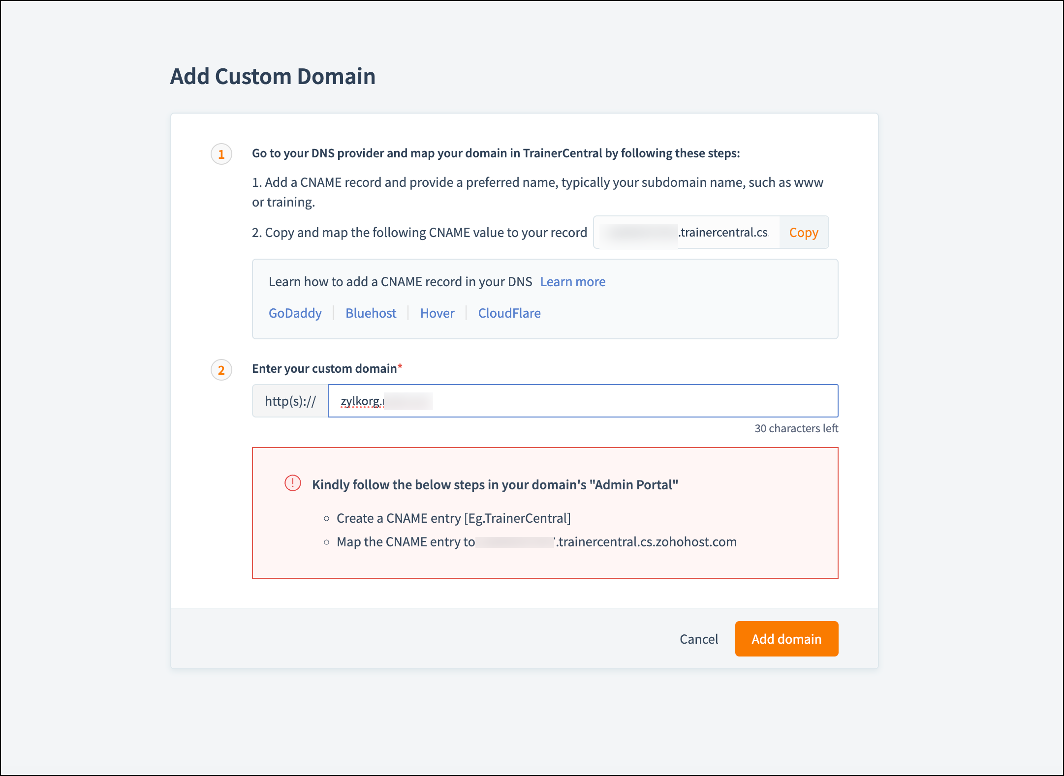 Points To: Enter the URL specified in the Custom Domain section of TrainerCentral (screenshot attached below)