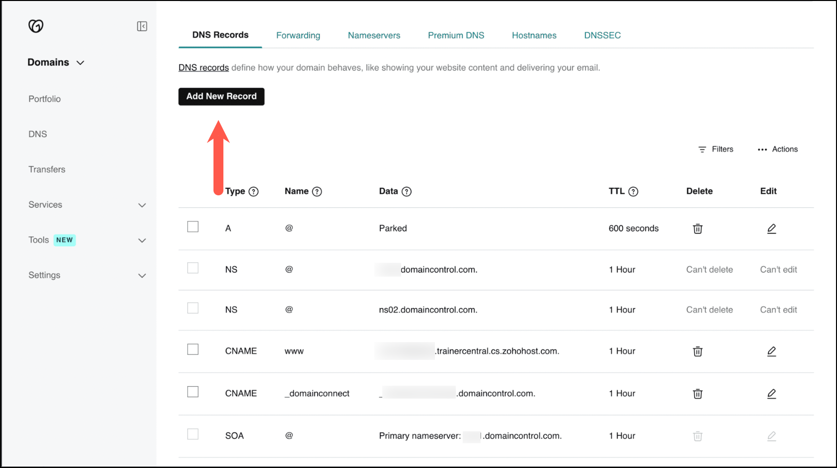 2. Select the domain you would like to use to set up your custom URL for your TrainerCentral site. Click on the DNS tab.