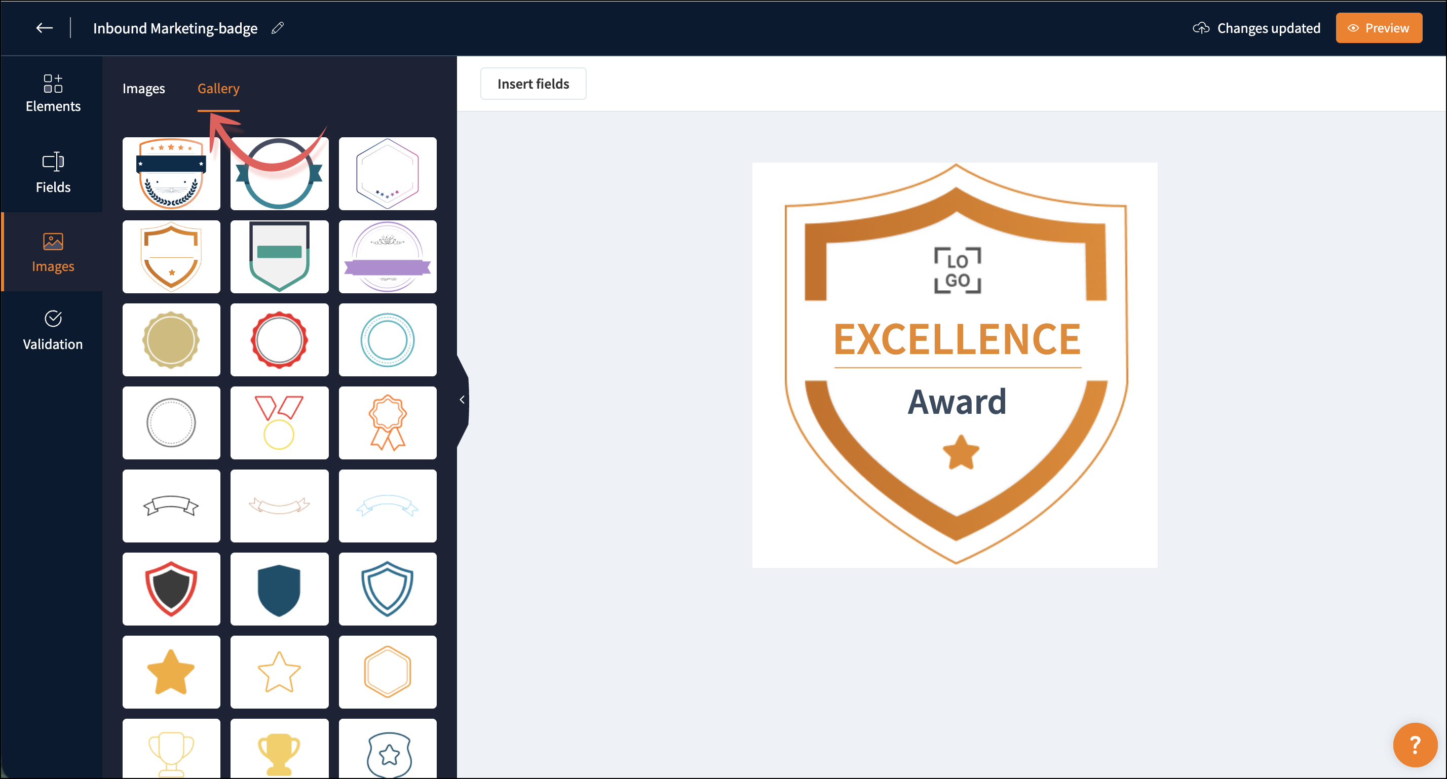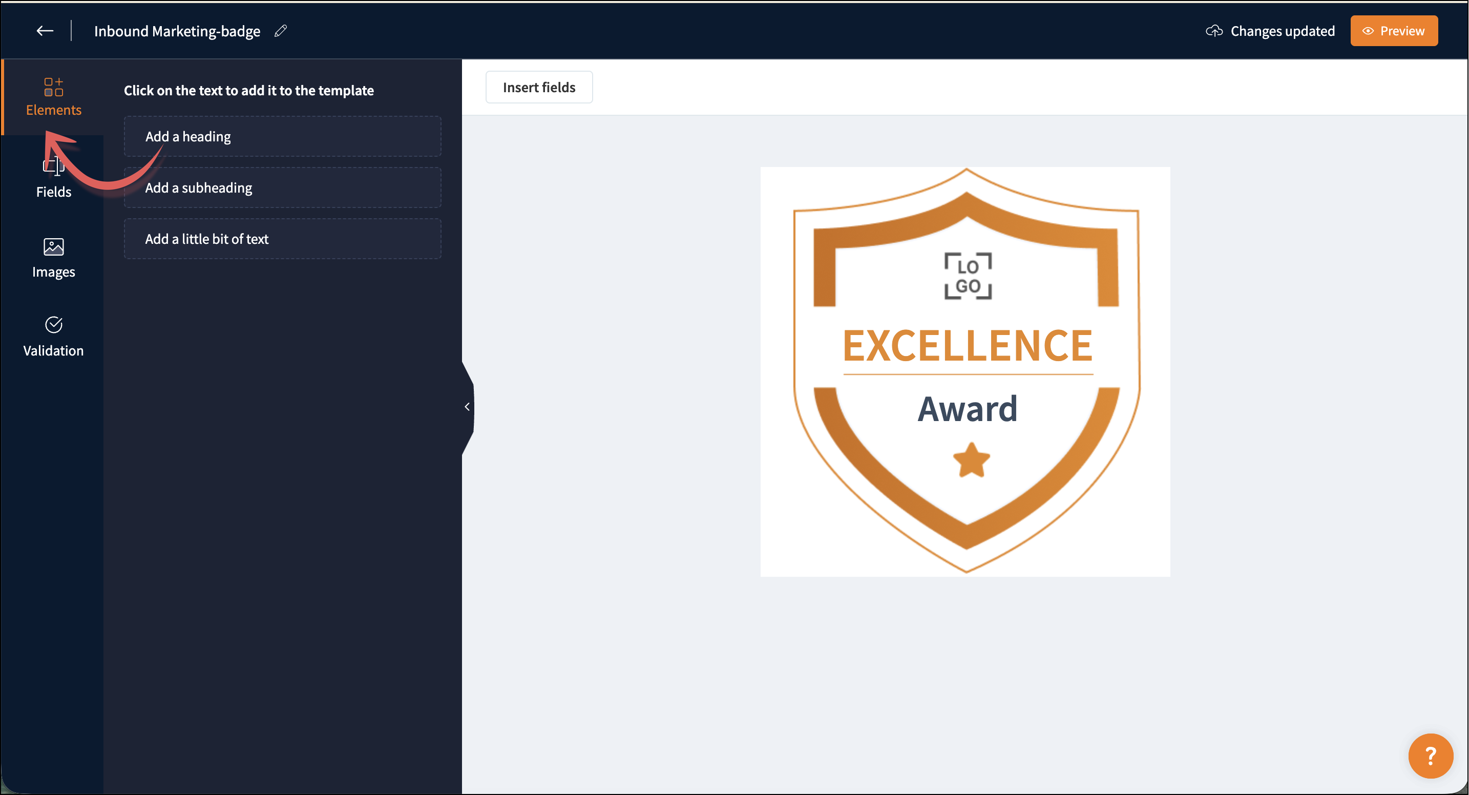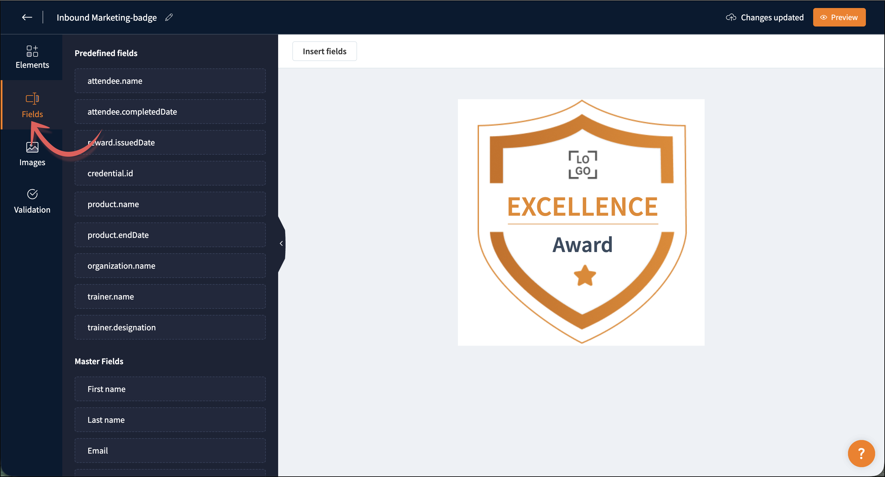 You can customize the badge template according to your requirements. The badge template consists of four components: Elements, Fields, Images, and Validation.