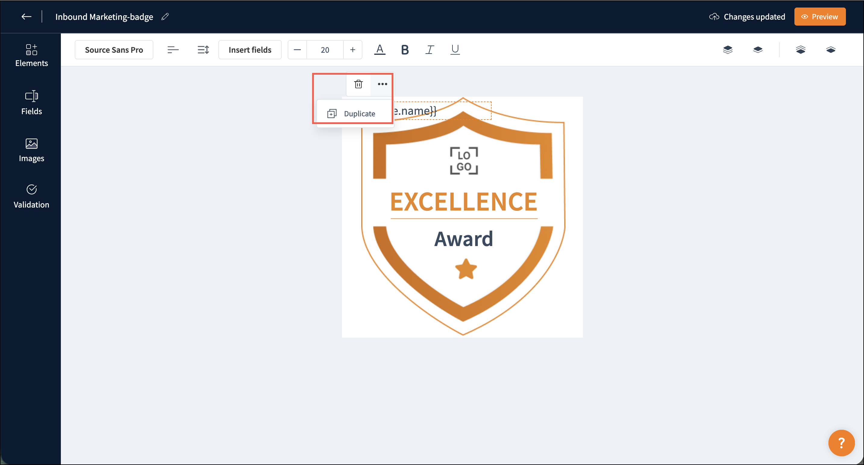 Include dynamic values in your badge template. Dynamic values refer to details that are automatically generated based on your course information. By inserting these fields in your badge template, the values will be auto-populated. For instance, attendee name, course name, and trainer name will be automatically generated.