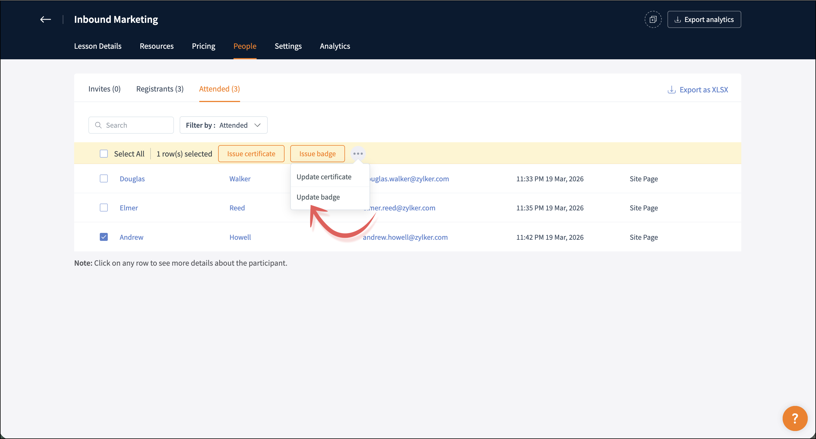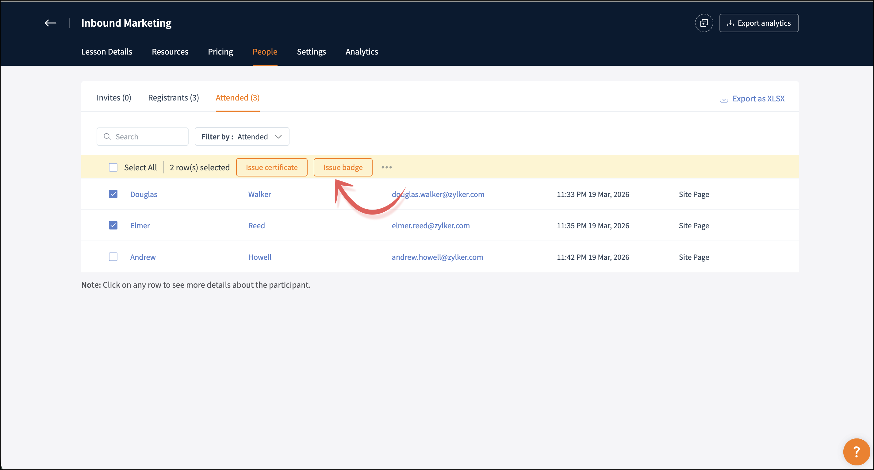 In a live workshop, you need to manually select the attendees to issue the badges.