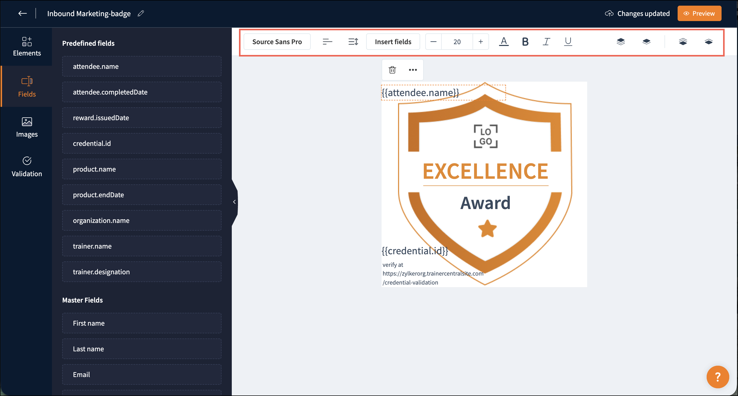Format text options let you modify the text elements and fields based on your preferences. With this option, you can set the tone and style of the badges.