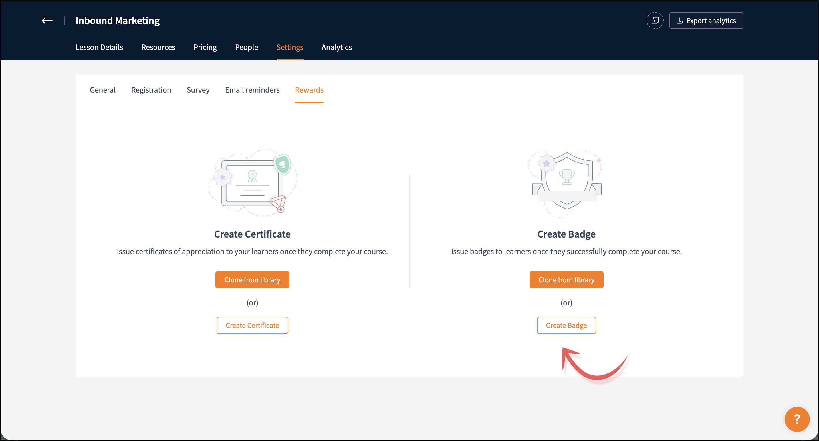 In the Create Badge, click Clone from library to choose the edited certificate template from the library.