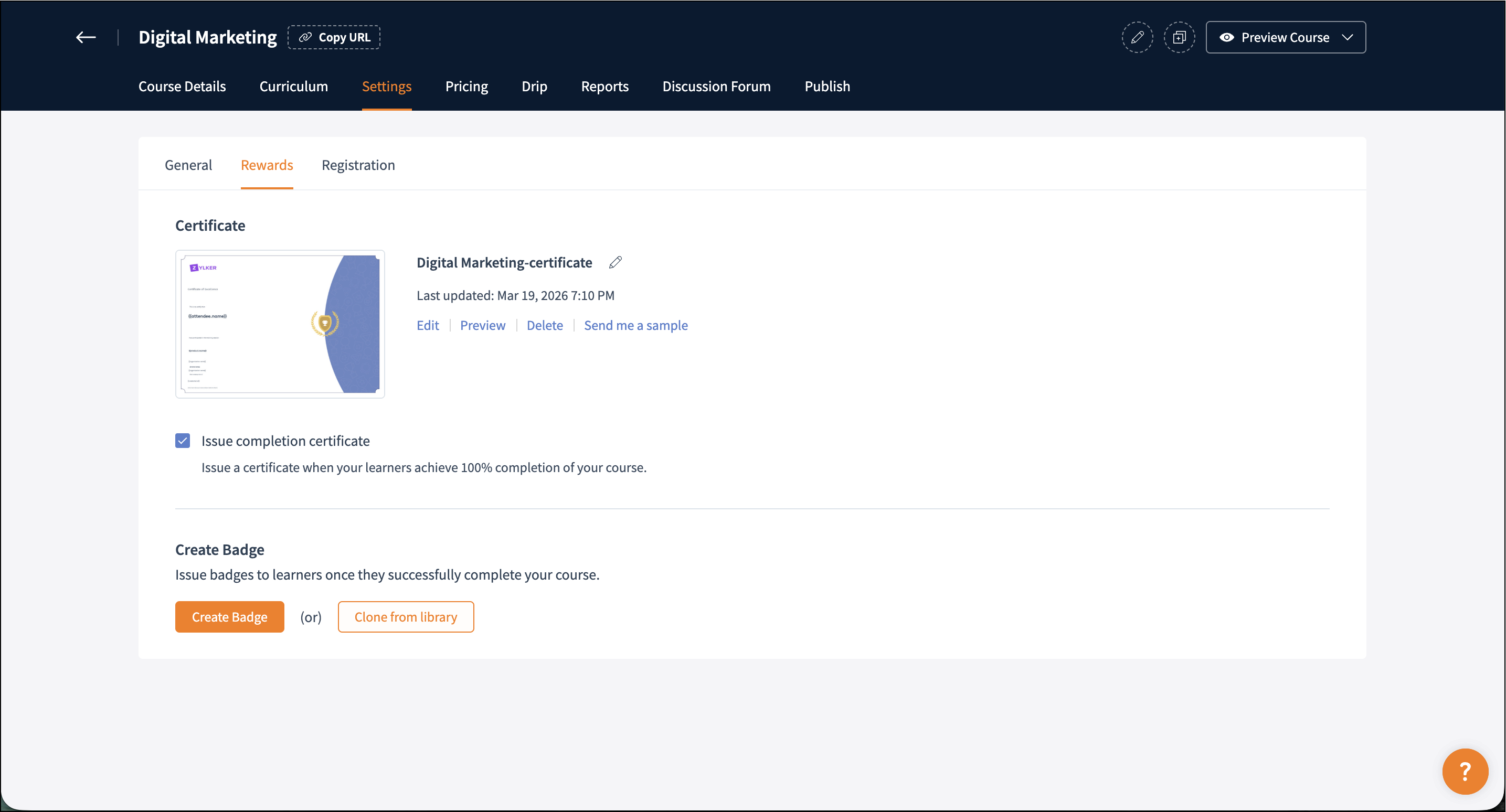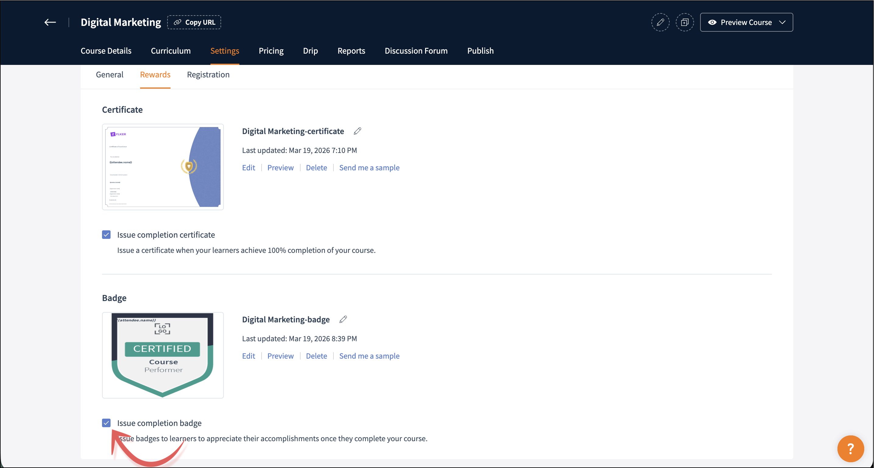 Send me a sample: Email the selected badge to yourself to see how learners receive it.