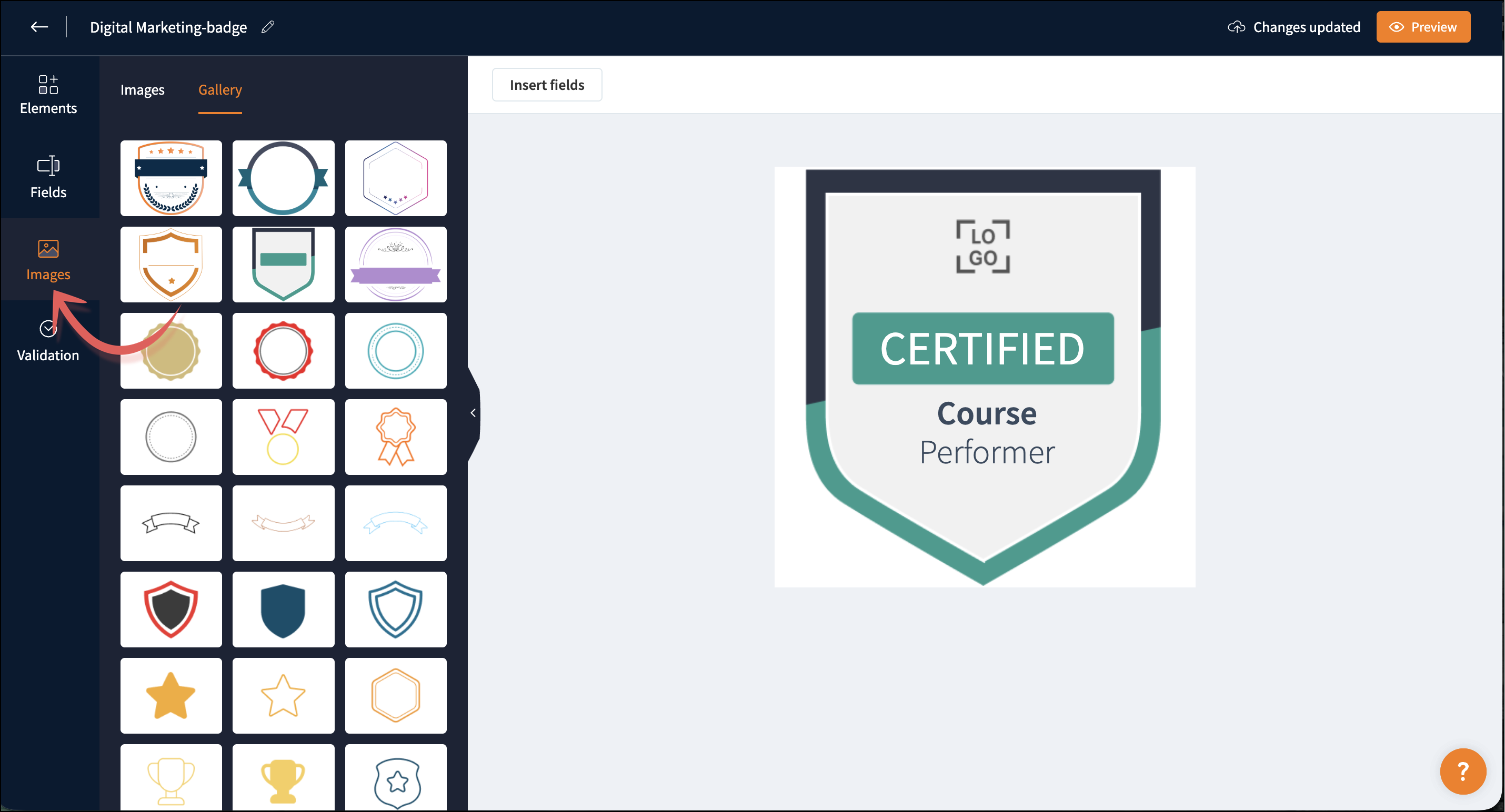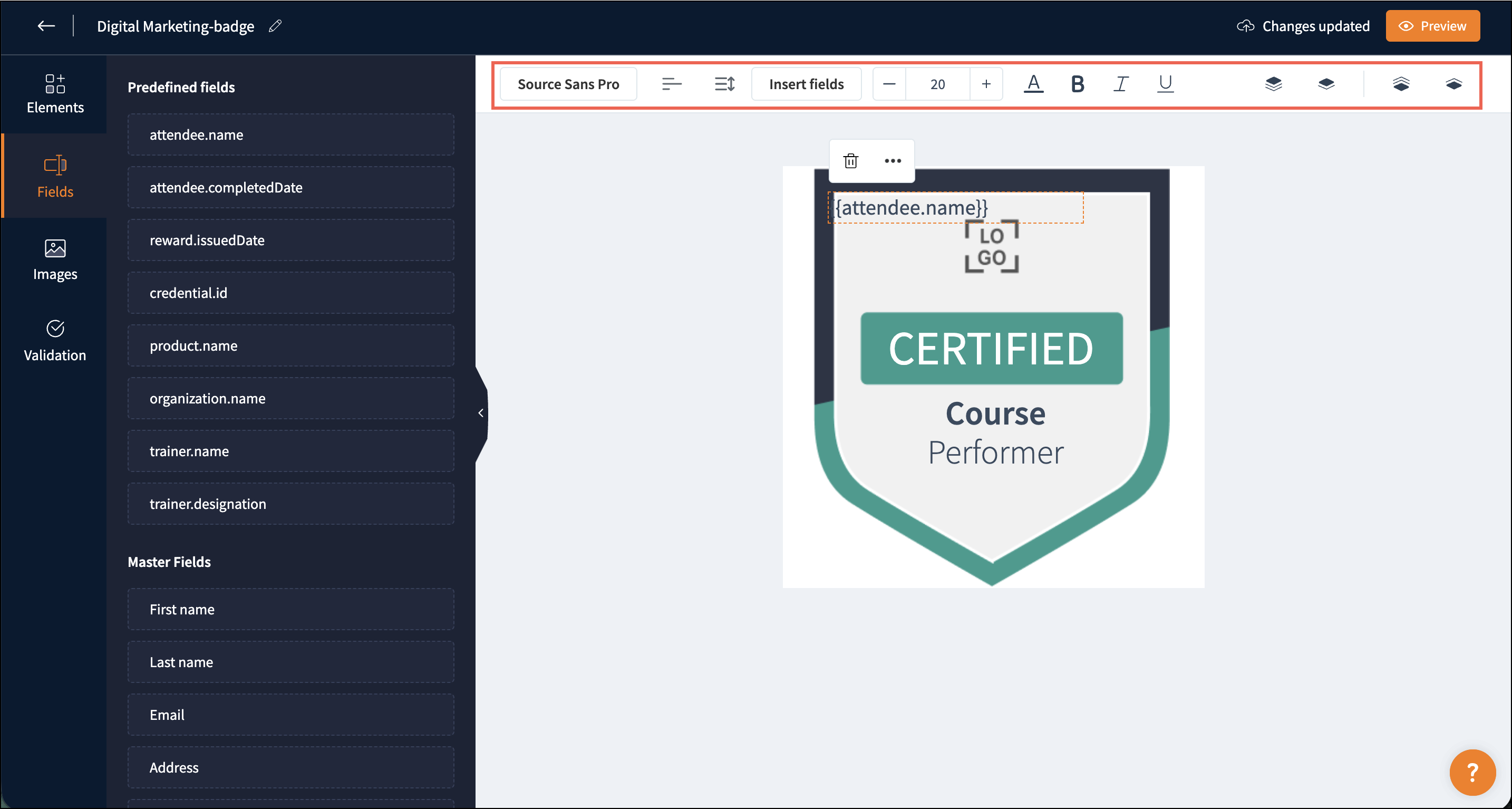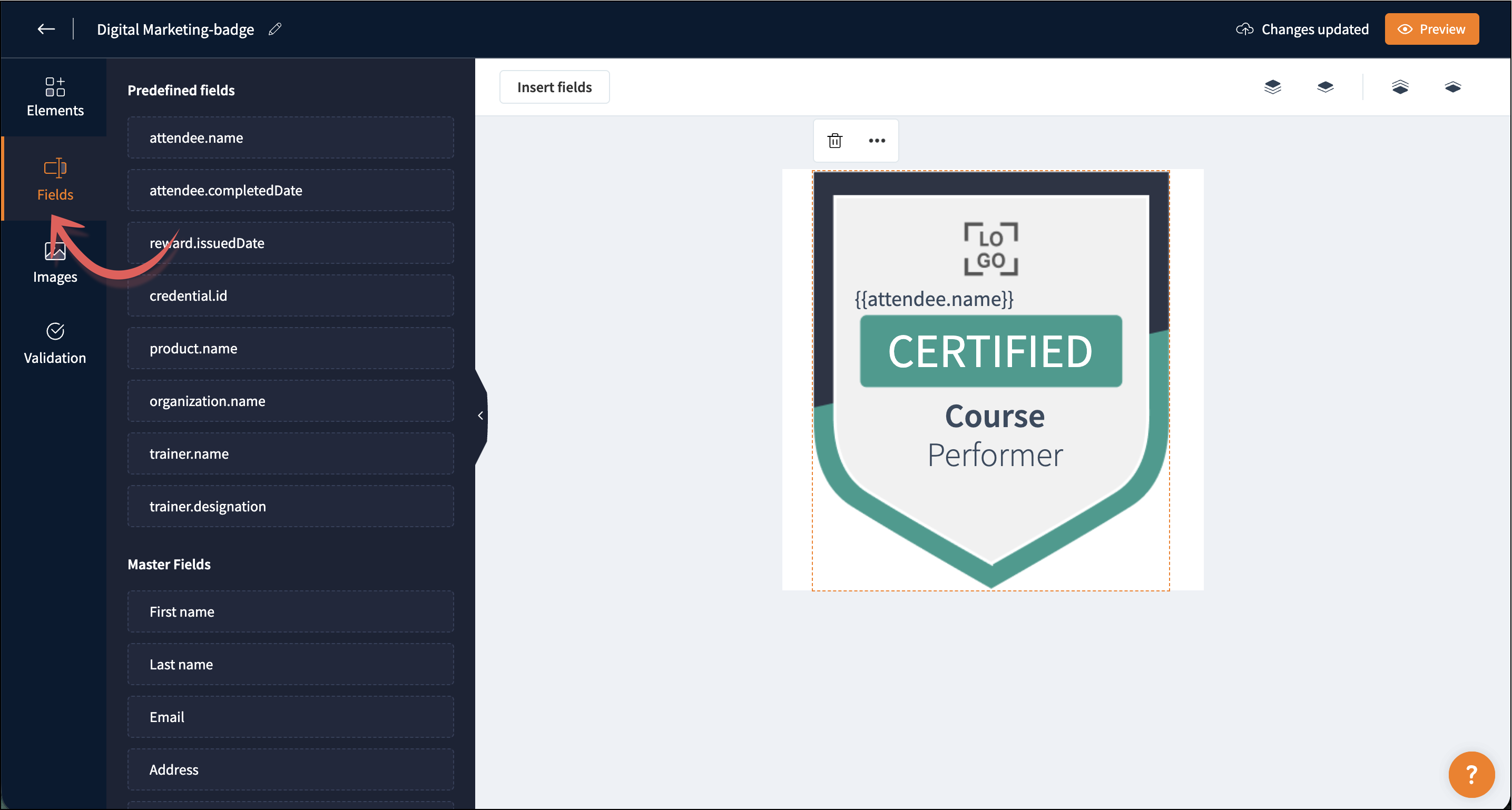 You can customize the badge template according to your requirements. The badge template consists of four components: Elements, Fields, Images, and Validation.
