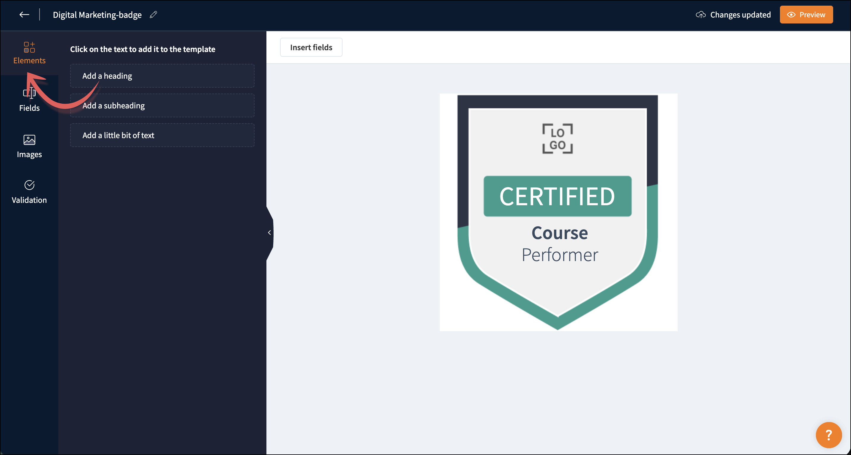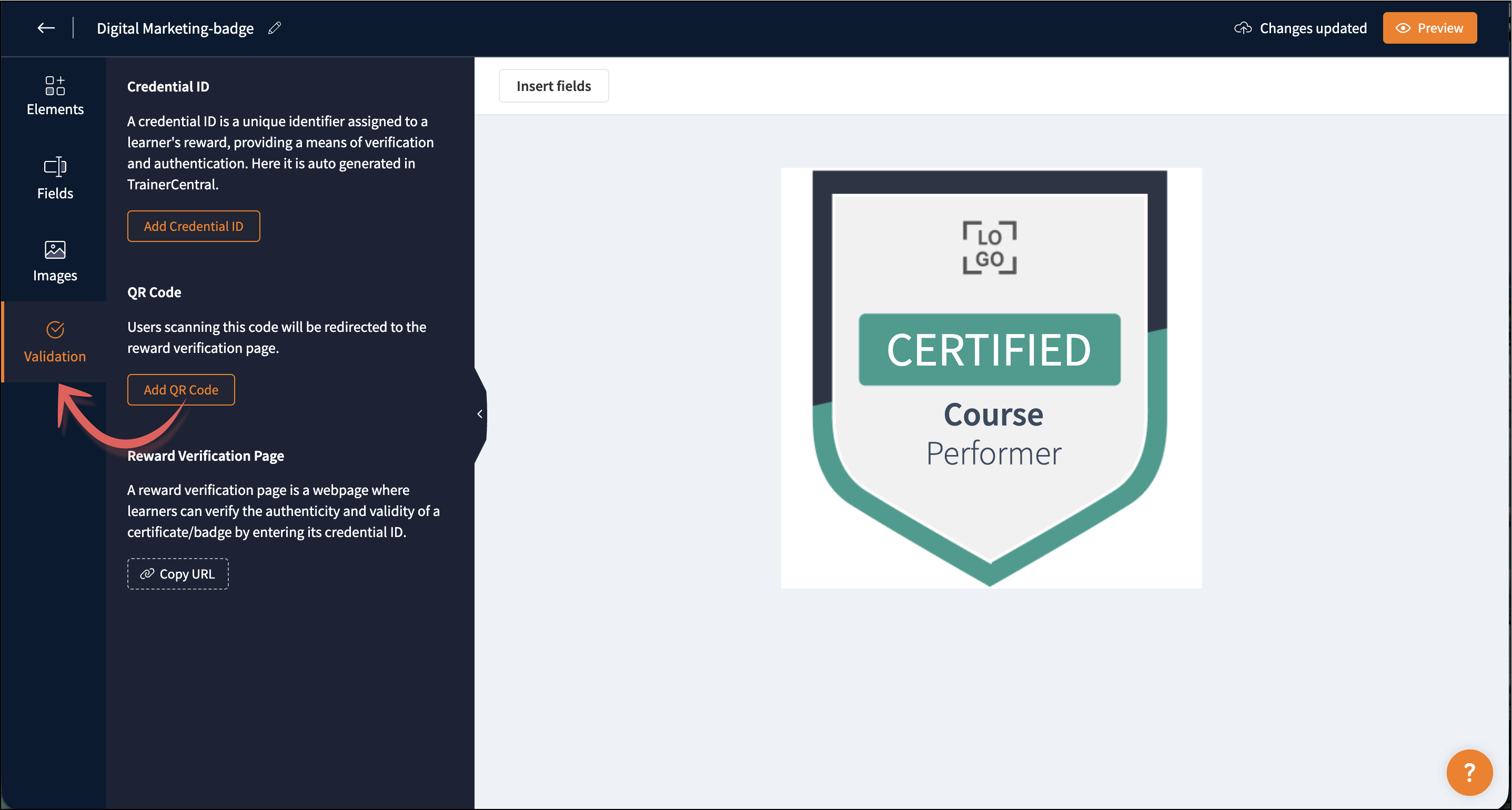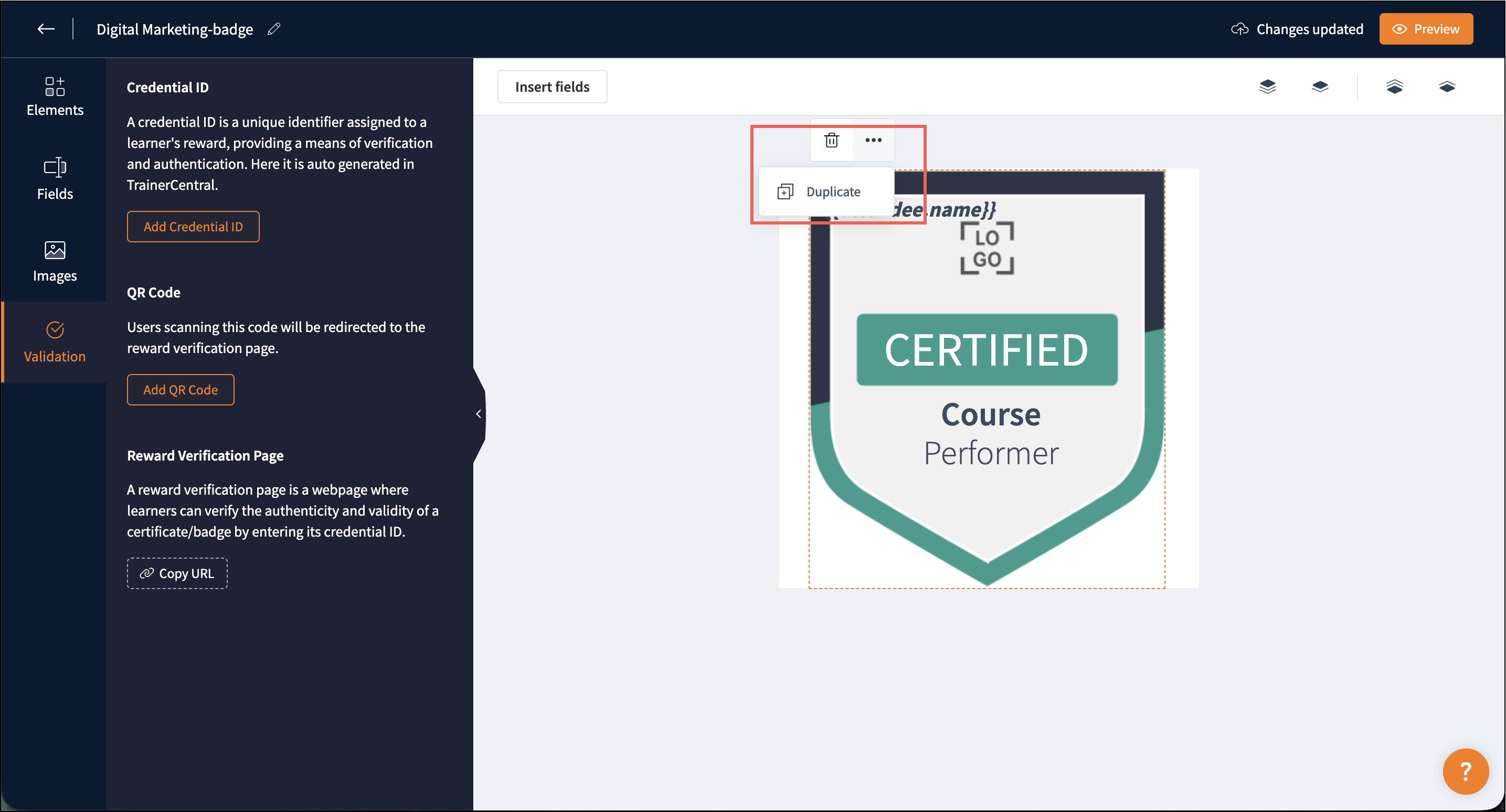 You can customize the badge template according to your requirements. The badge template consists of four components: Elements, Fields, Images, and Validation.