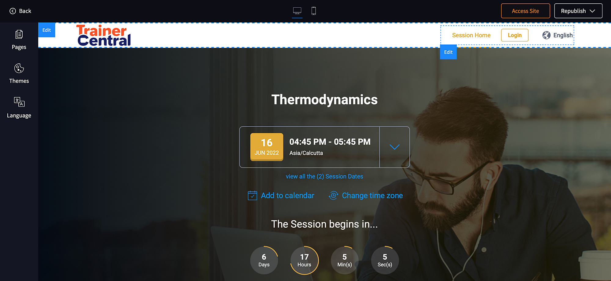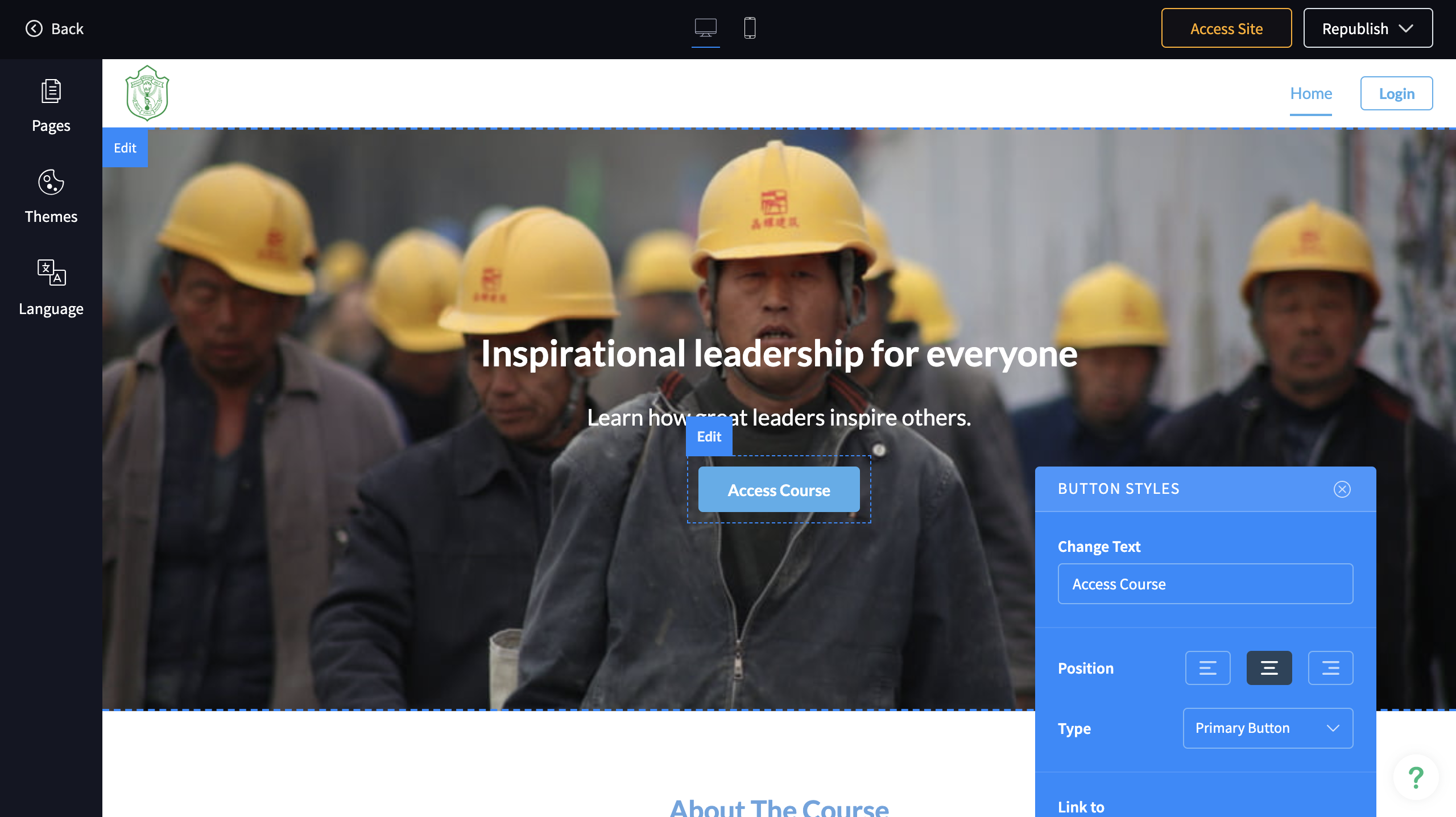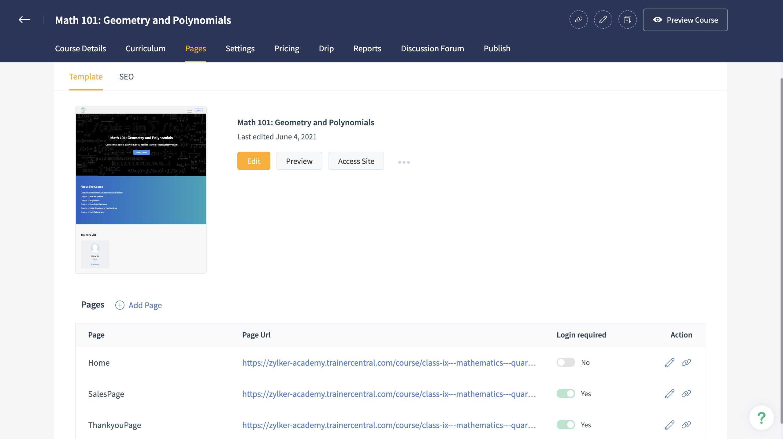 2. Click on Edit which opens up the course site builder. Here you can add pages, configure navigation, add languages using the left pane.