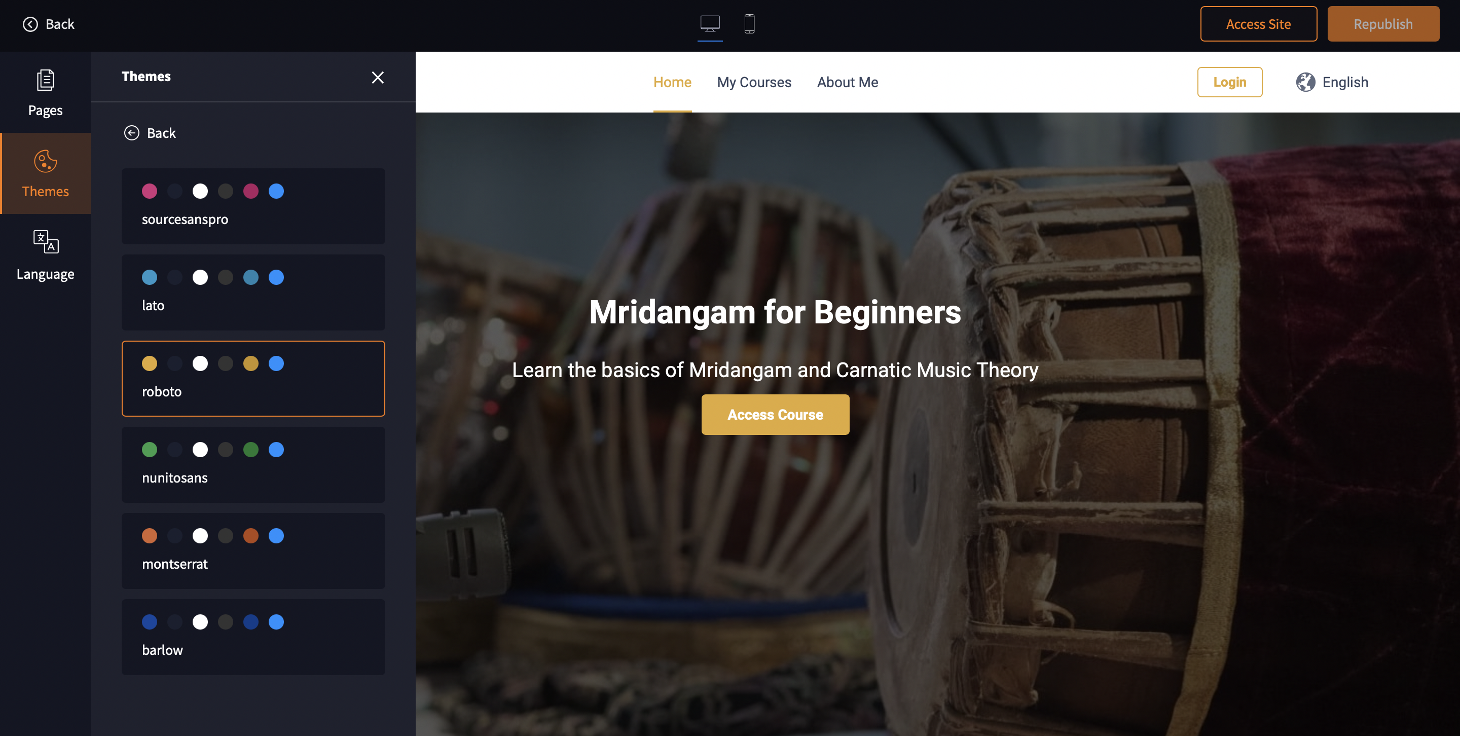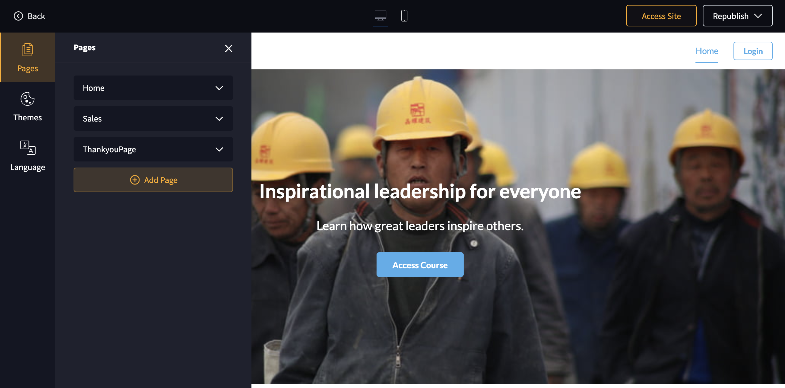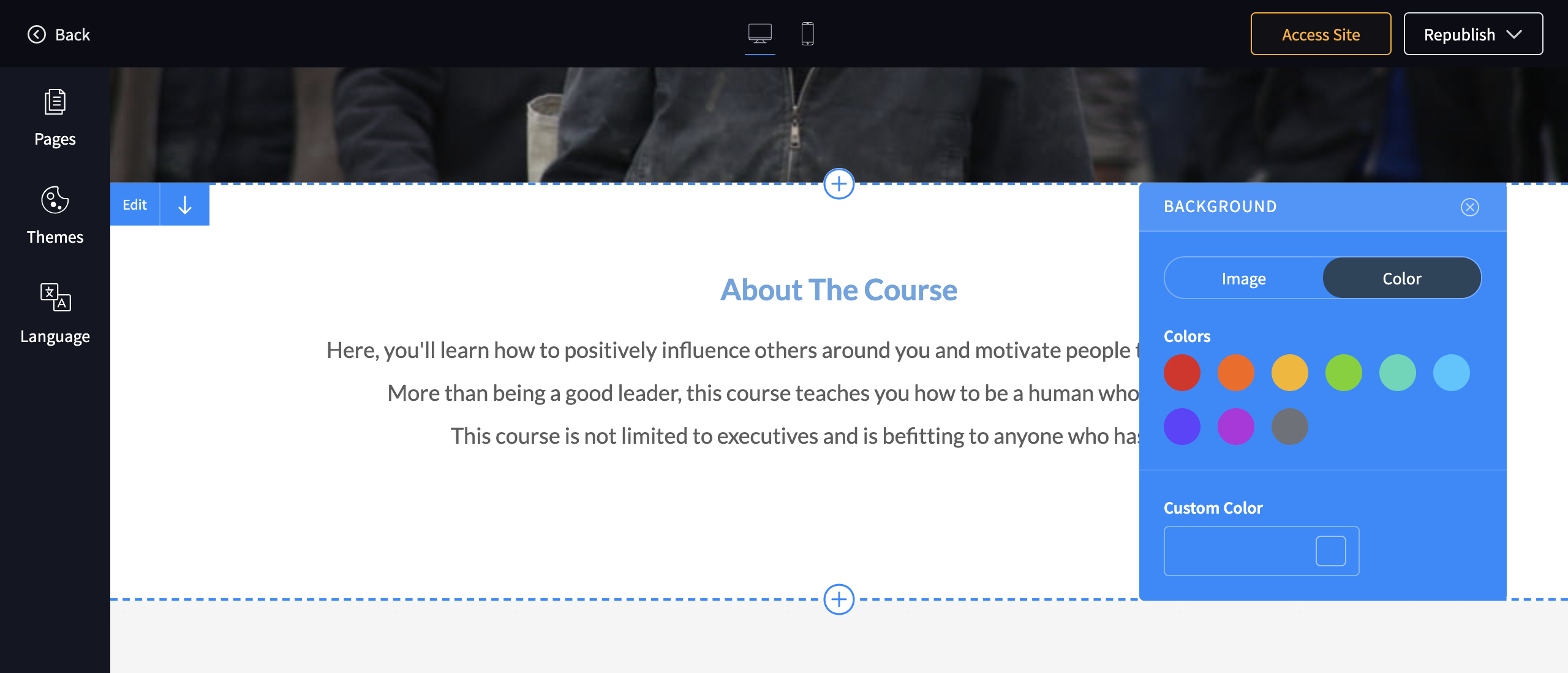 2. Click on Edit which opens up the course site builder. Here you can add pages, configure navigation, add languages using the left pane.