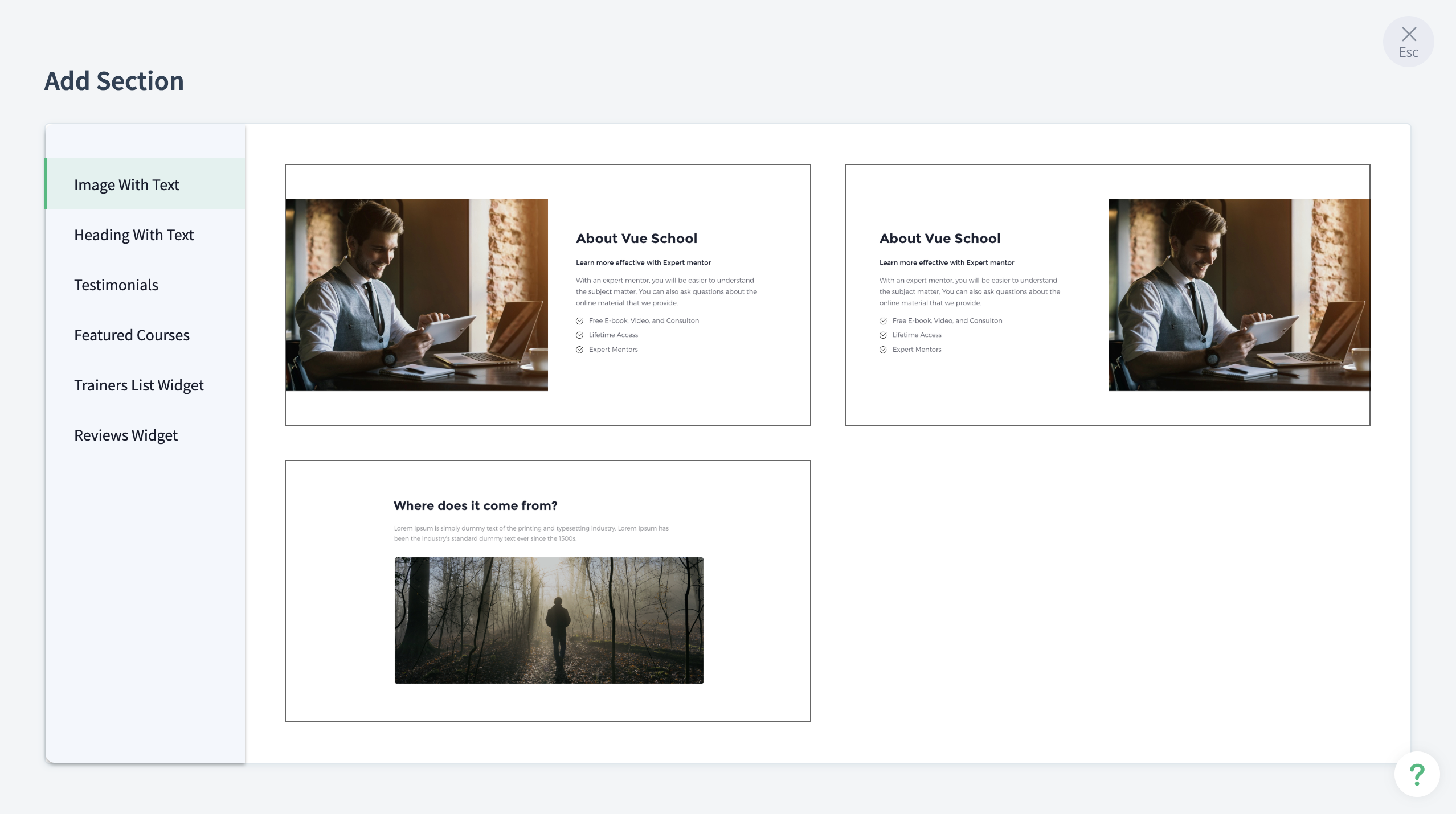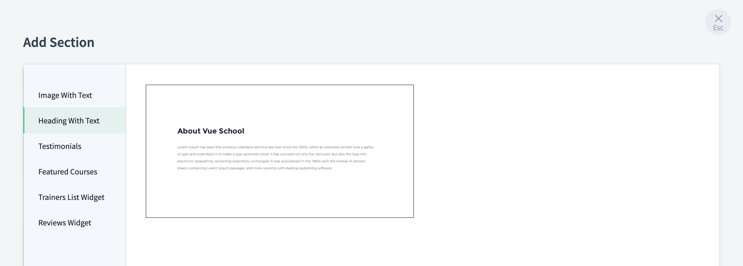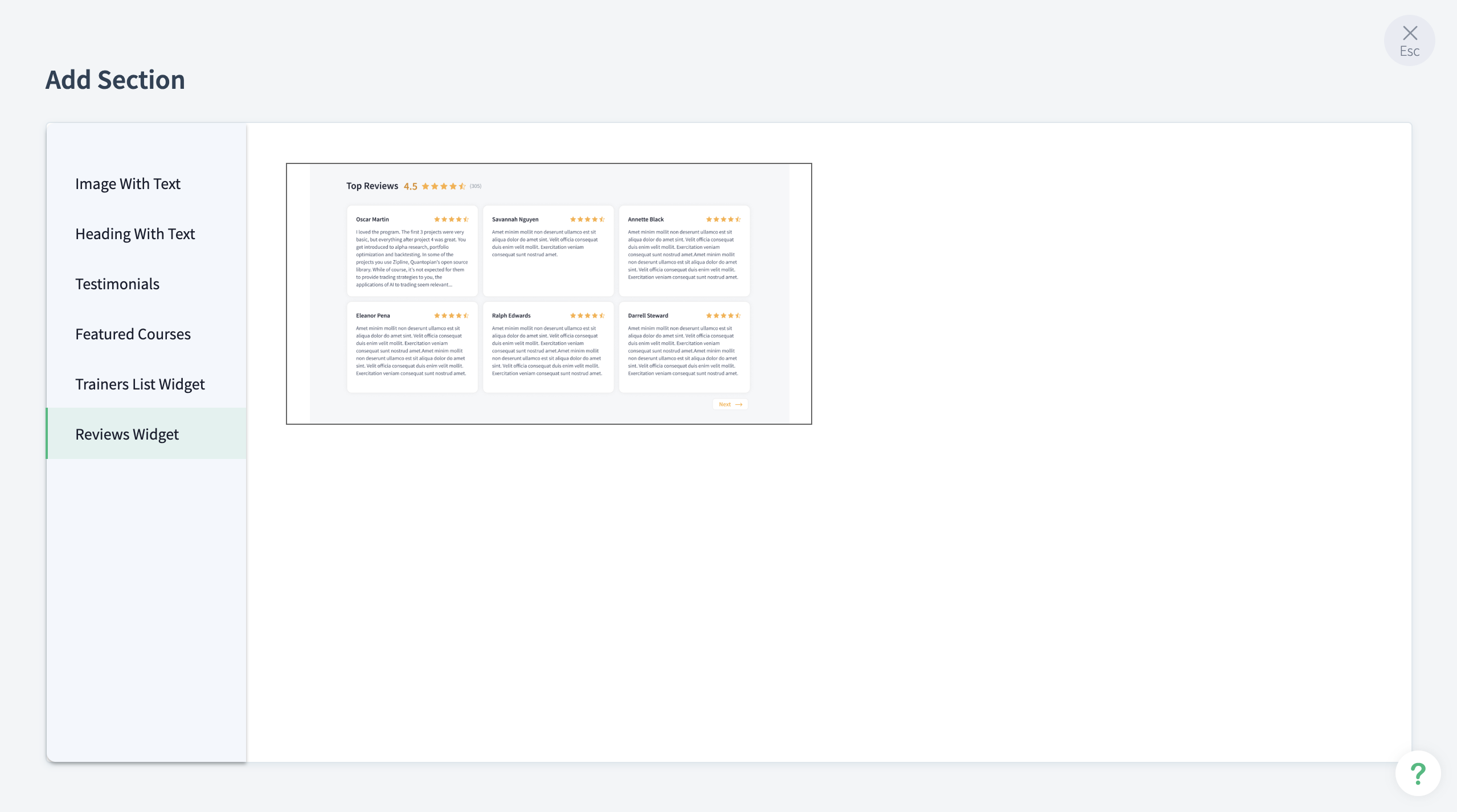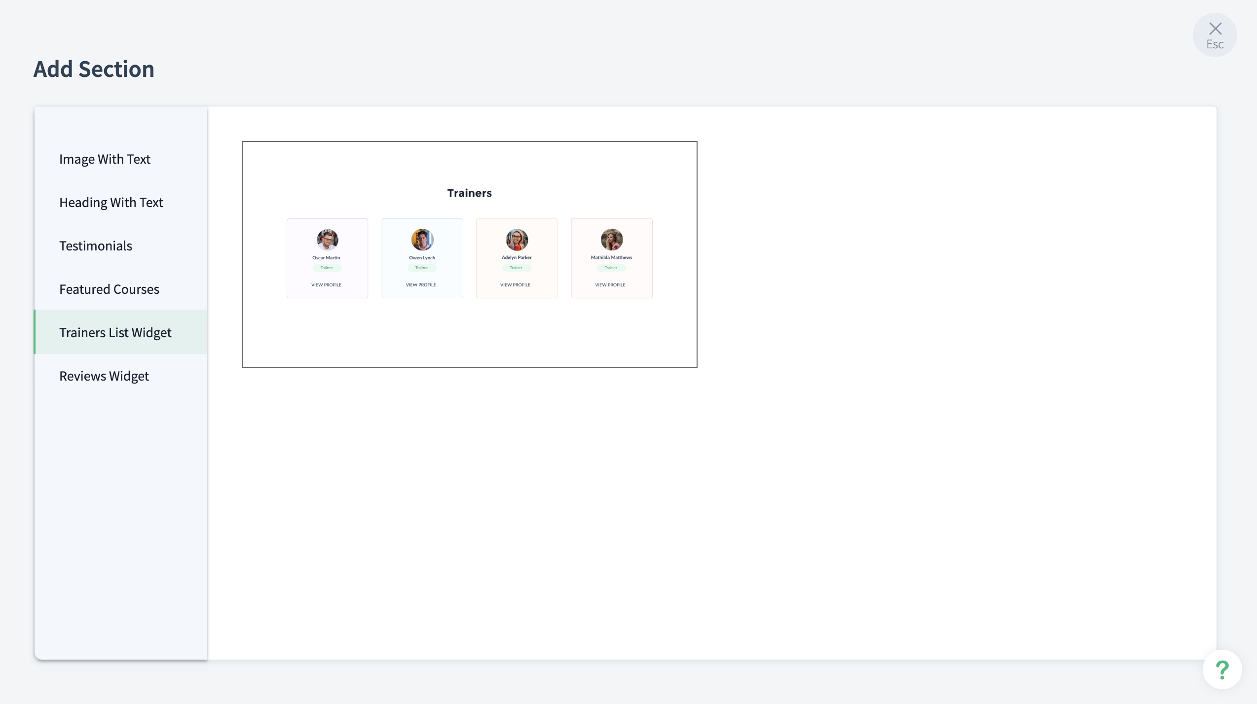 TrainerCentral offers various custom sections that you can add to your page. The sections (listed below) can be inserted in any part of the page suiting your branding and design preferences. Click on any default section (explained above) and select the plus (+) icon to add a custom section.