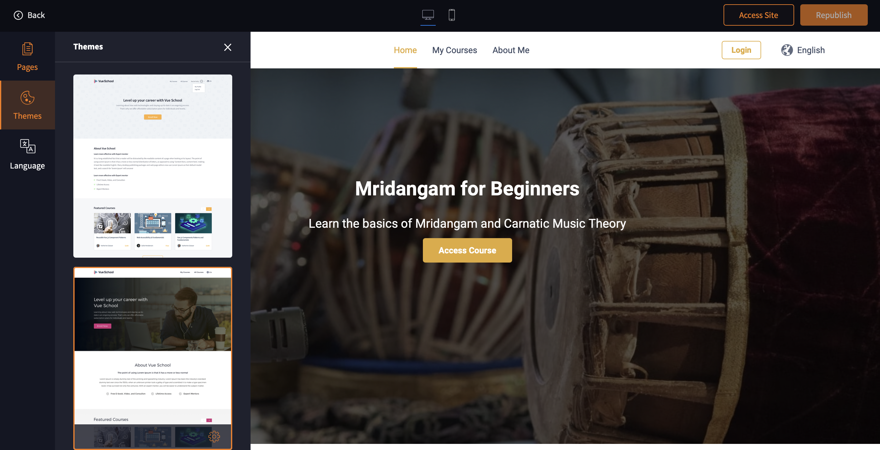 You can choose a theme for your course website from the various customisable themes offered by TrainerCentral. You can click on Themes from the left pane and choose the preferred one.