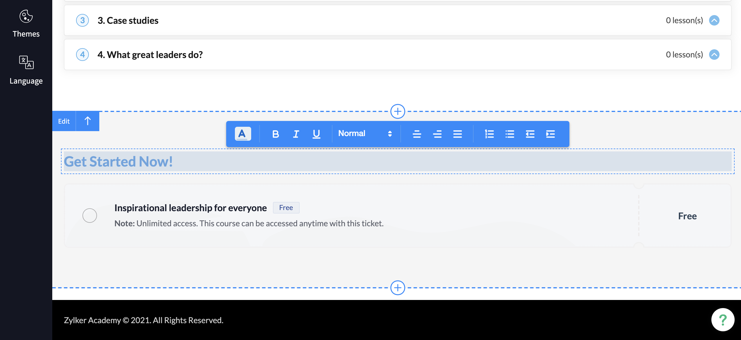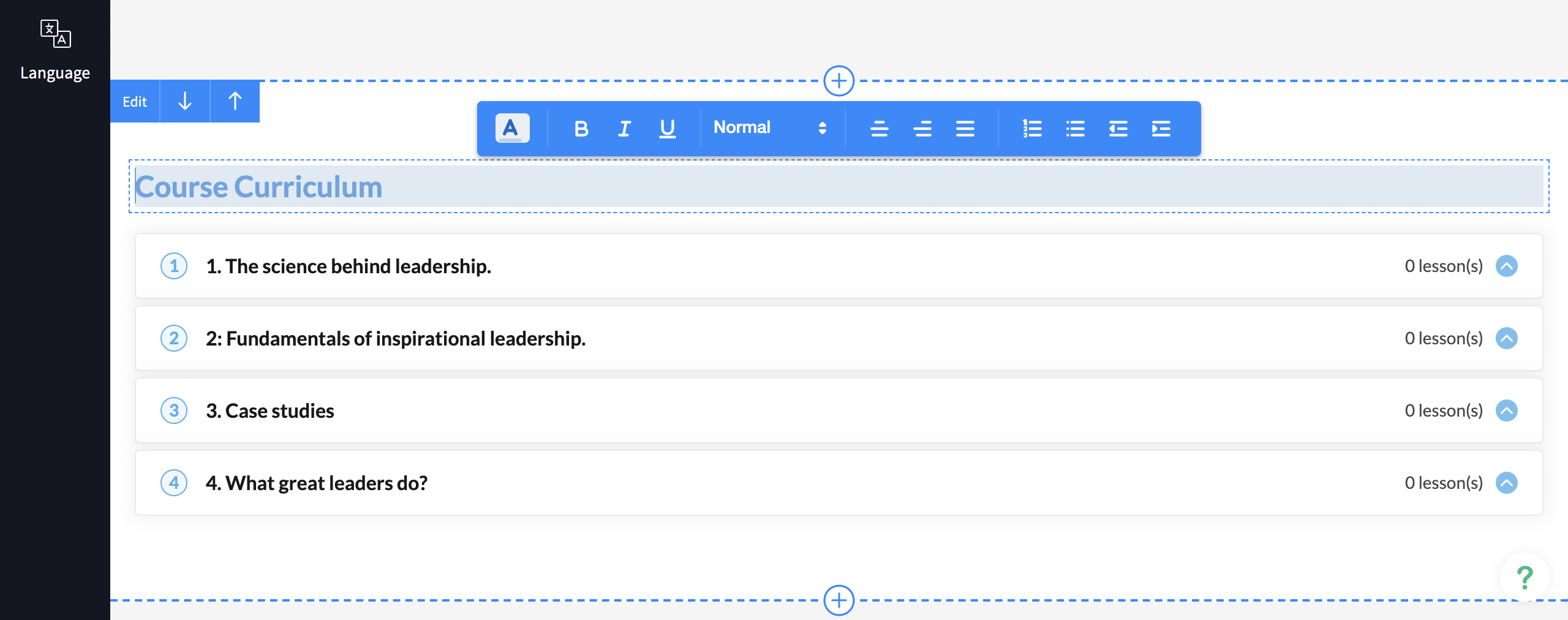 The course page offers some default sections (listed below) that you can edit. You can change the background color, alter the CTA text, configure the alignment differently and much more.