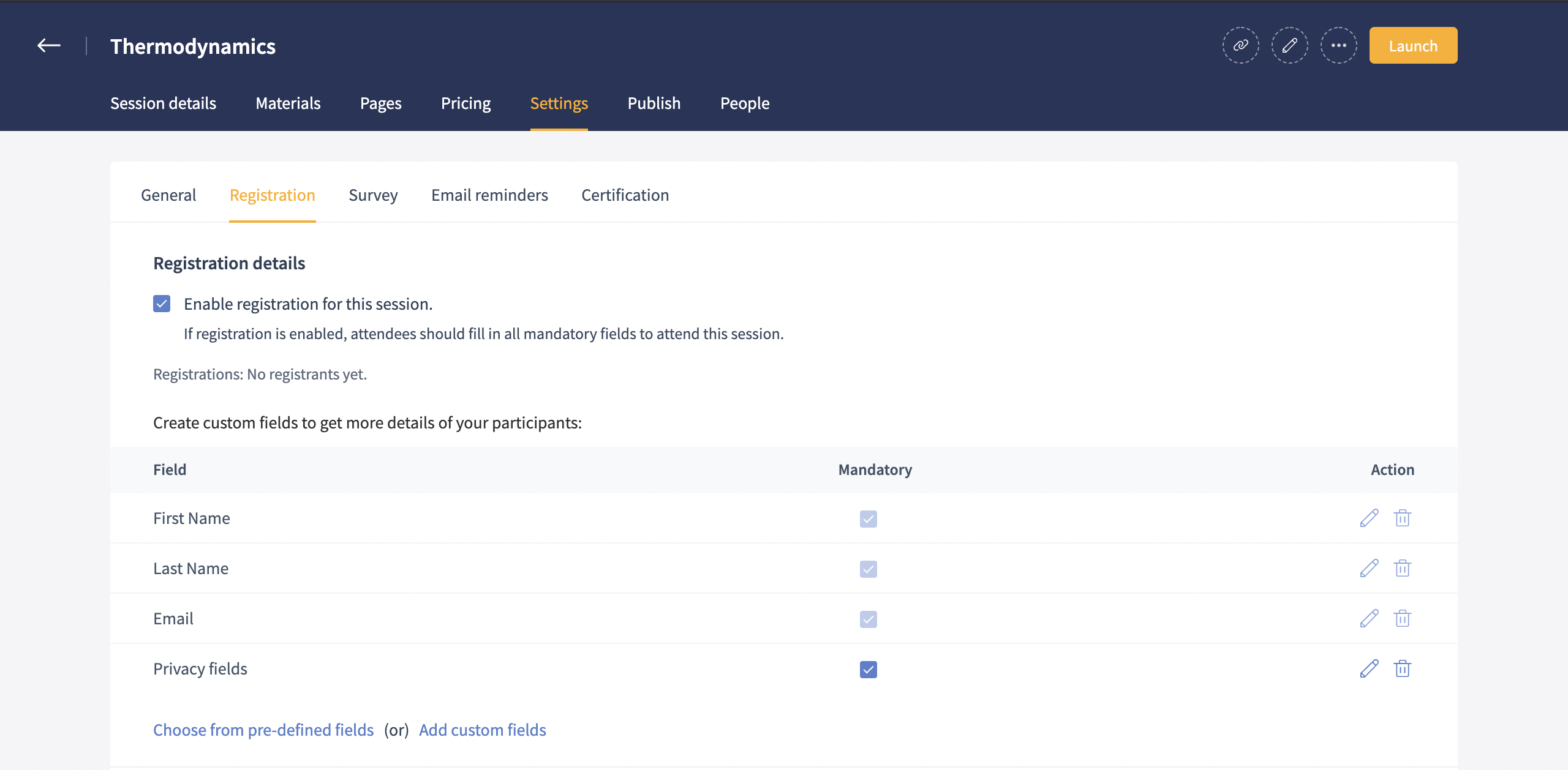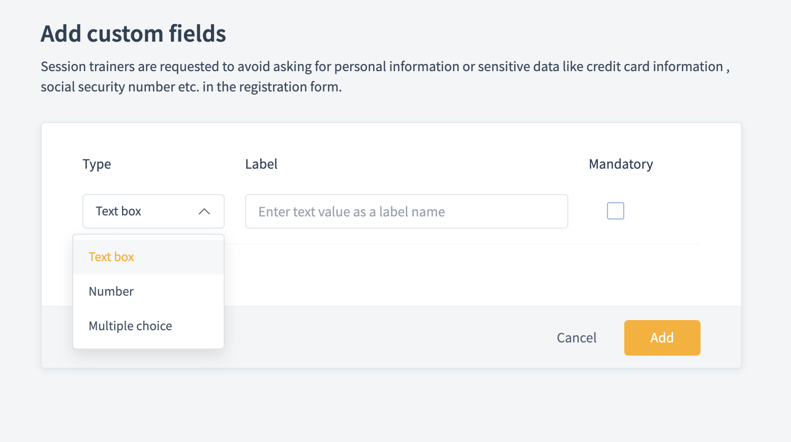 You can also choose to add the pre-defined fields offered by TrainerCentral by clicking on Choose from Pre-defined field. Once you select the fields, click Save.