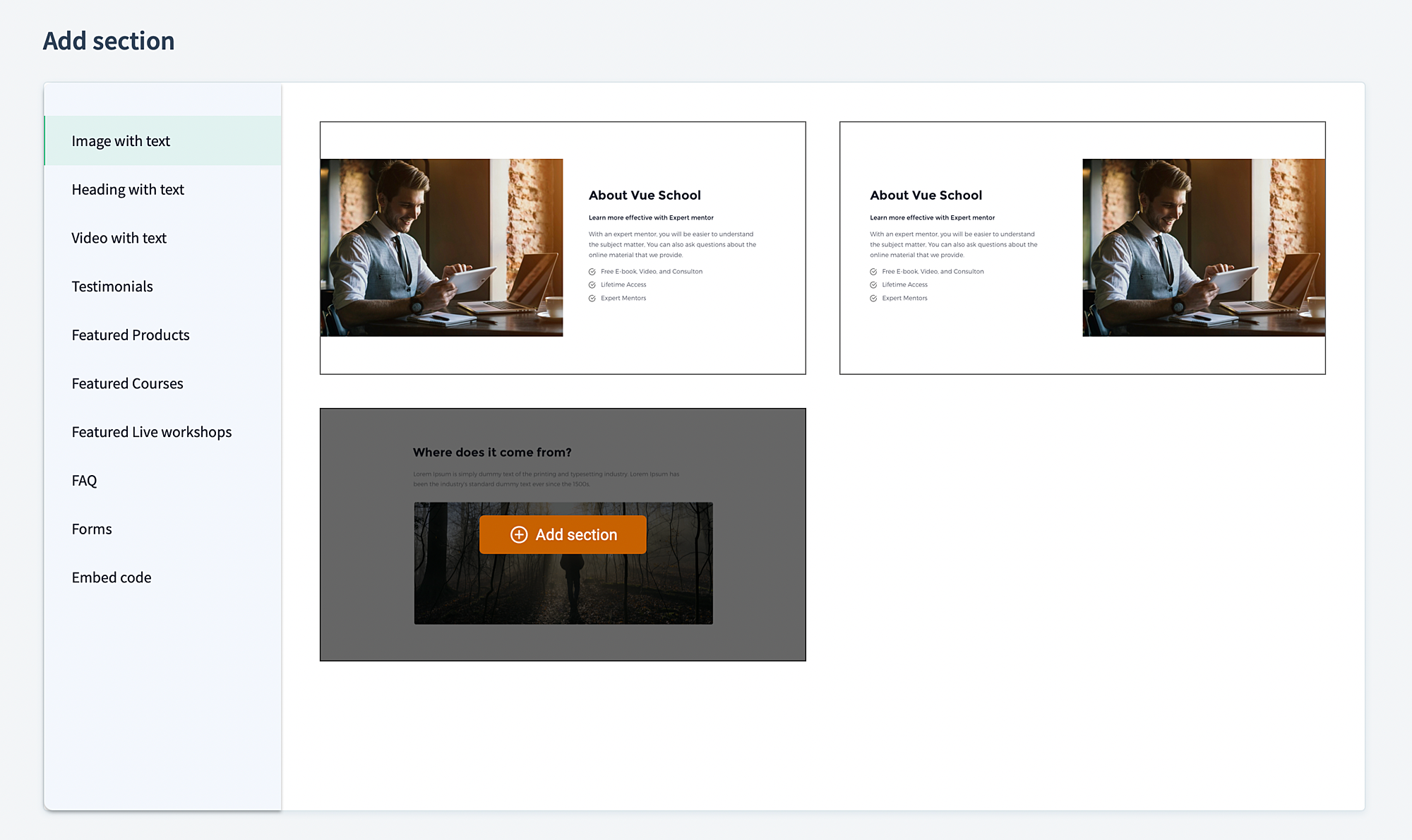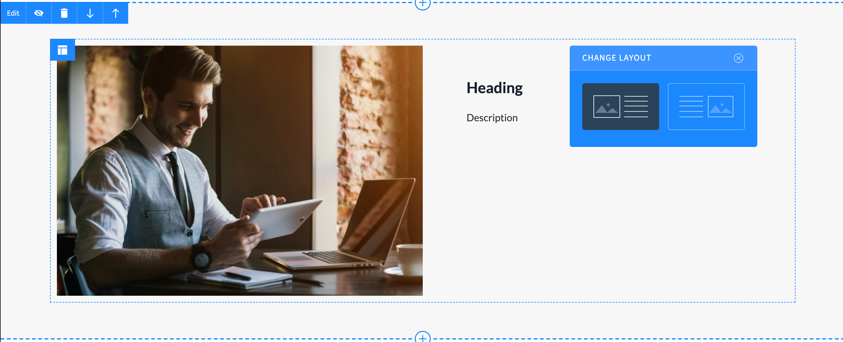 You can add a section comprising of an image with relevant textual description or content to your site. Click the plus (+) icon next to any default section and choose Image with text.