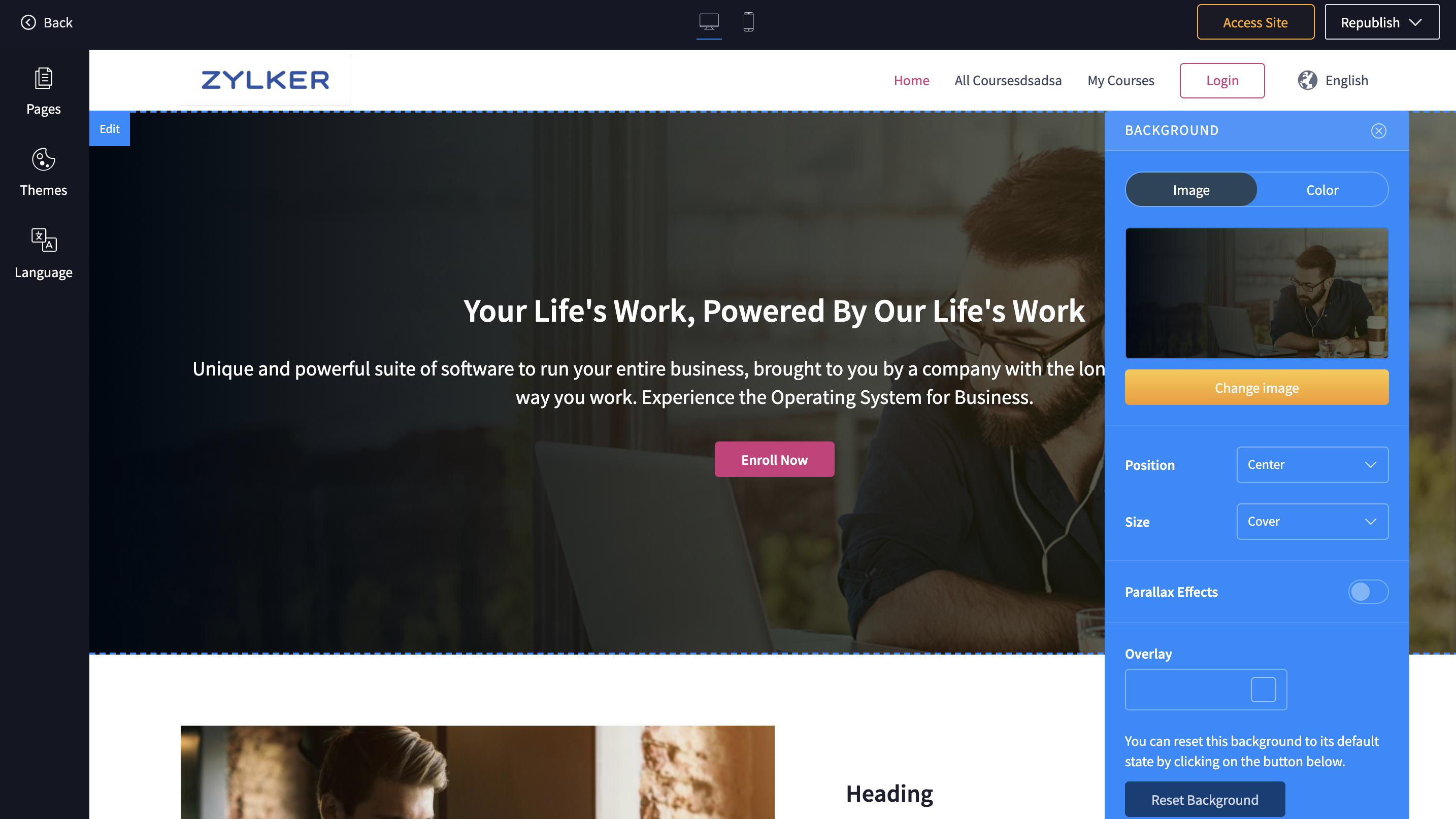 2. You can edit the default section of your academy home page by altering the background image/color, applying parallax effects, editing the CTA etc.