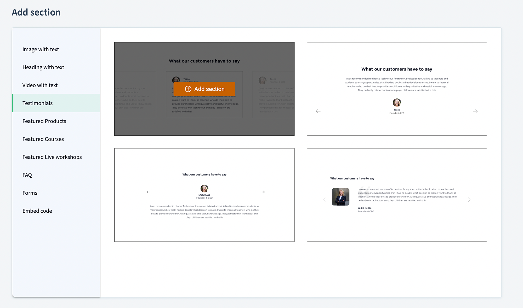 You can add various sections to your website by clicking the plus (+) icon next to any default section and choosing the section you wish to add. The list of sections offered in TrainerCentral are discussed below.