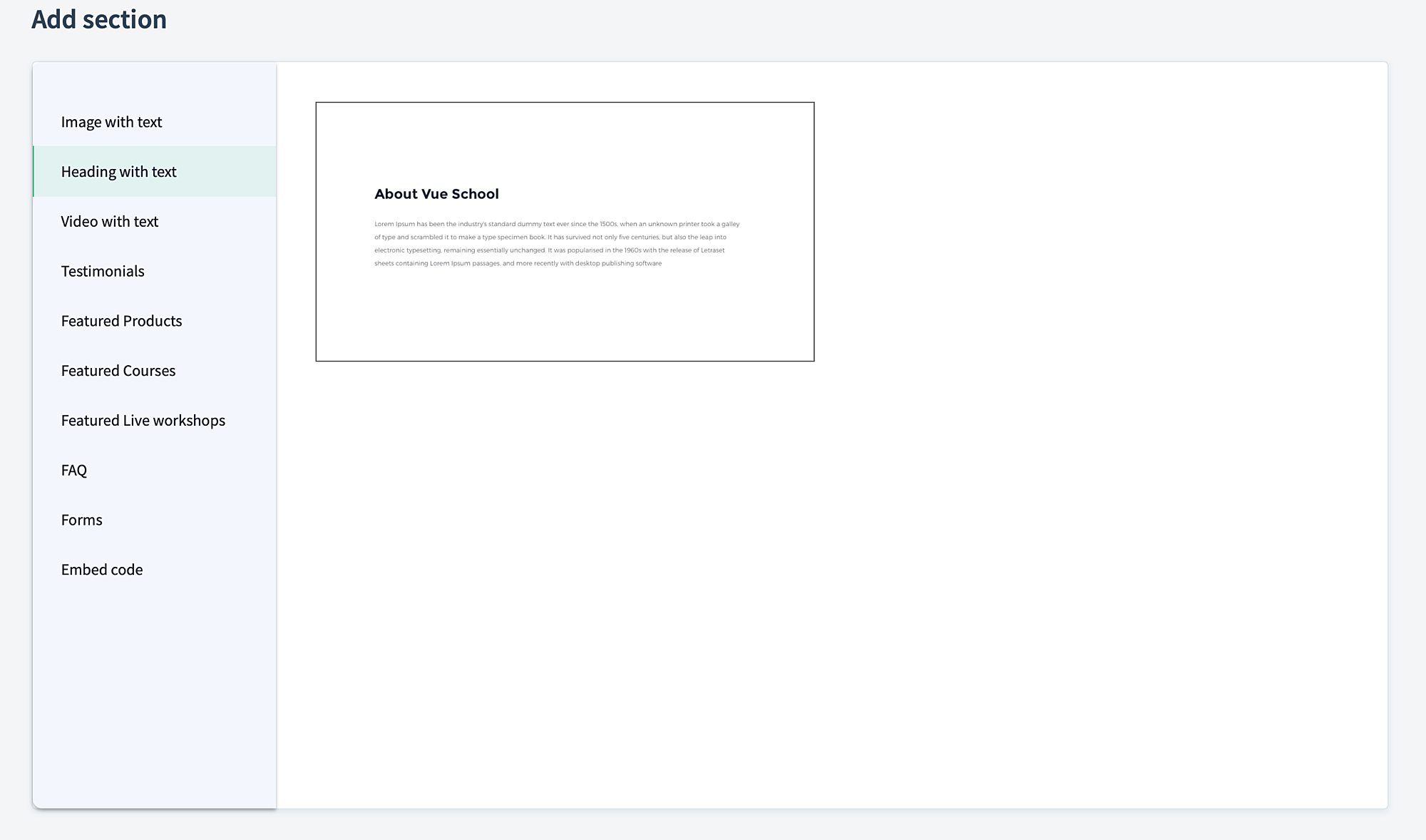 The Text with Heading section allows you to add a section with a text portion and also customize the heading of that section. You can edit the layout of the page and also change colors of the background if you wish.