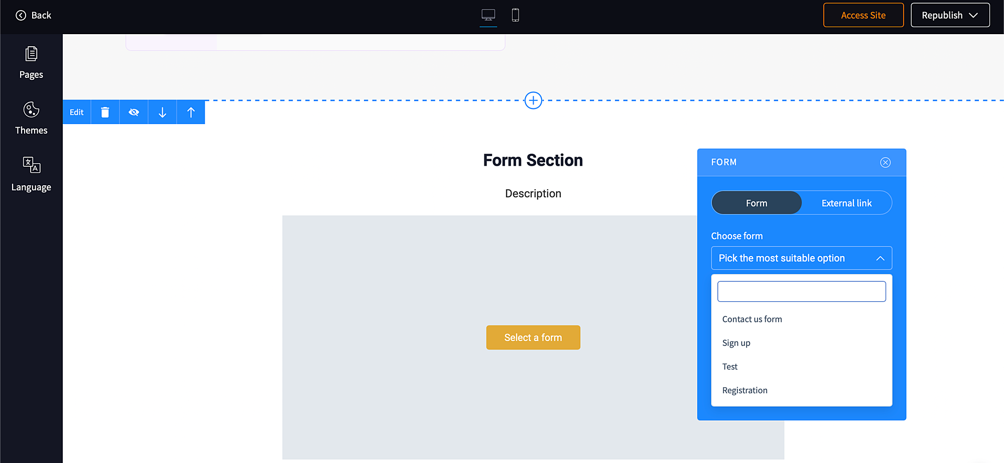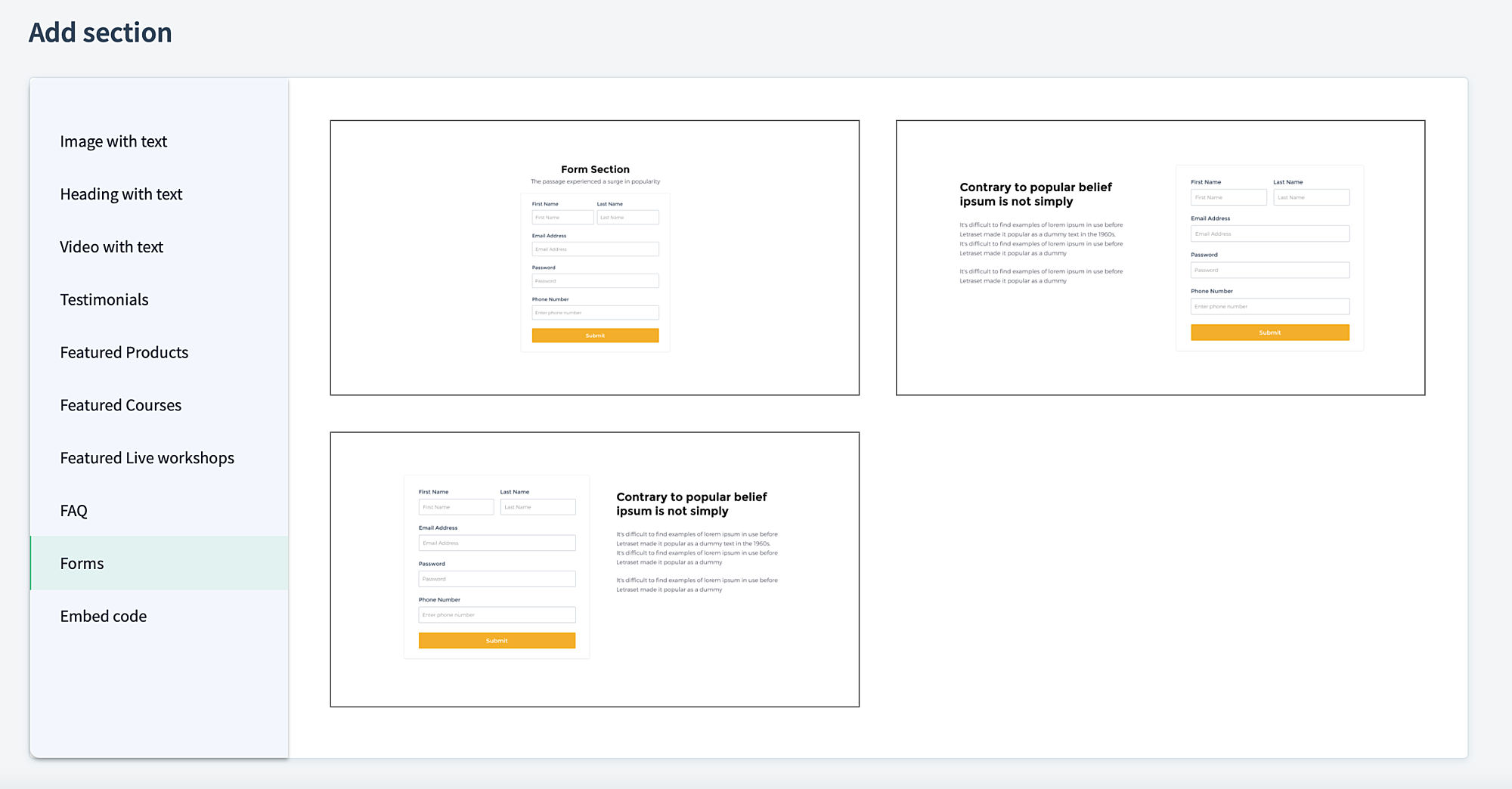 All forms created and customized in your academy can be used across any site that you edit. To add a form, click the plus (+) icon next to any default section and choose Forms.