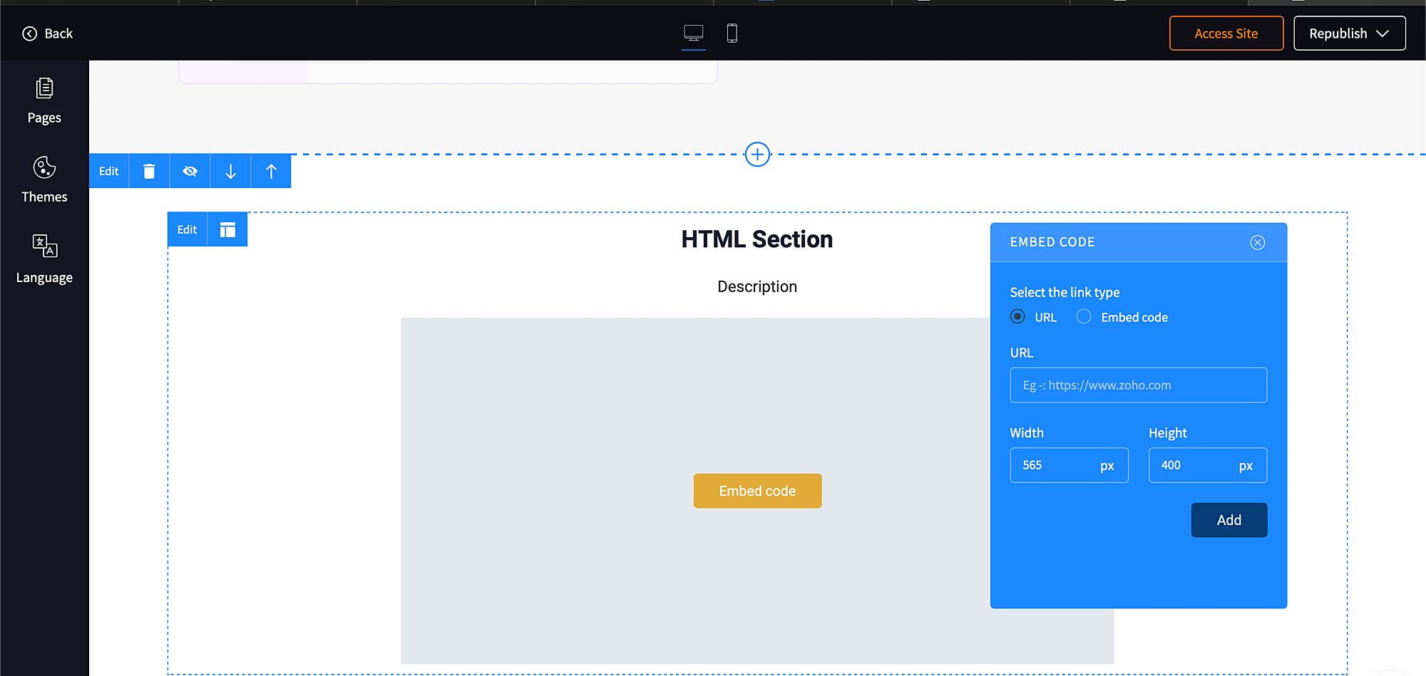You can add any URL or Iframe code to your site by clicking Add new section and choosing HTML.