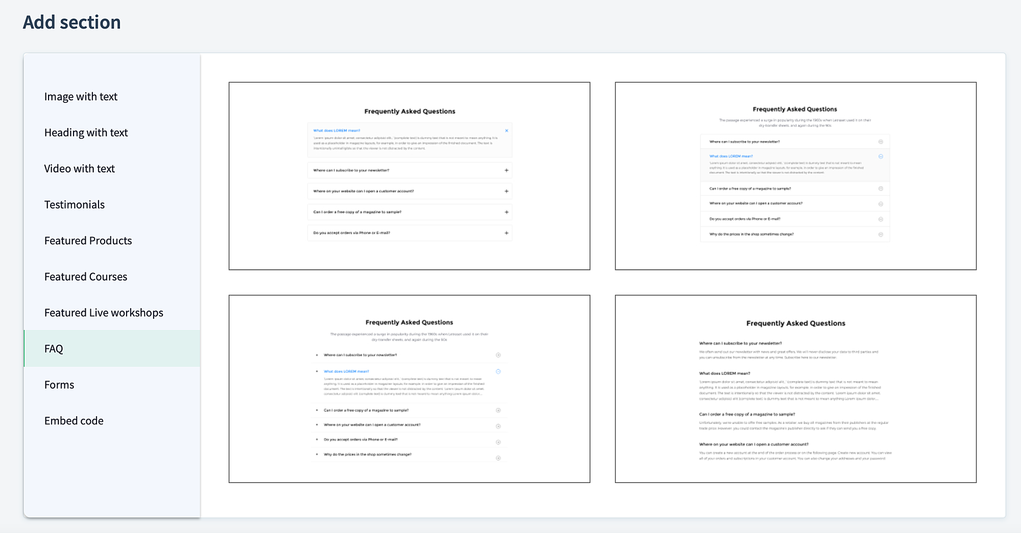 Click the plus (+) icon next to any default section and choose FAQ.