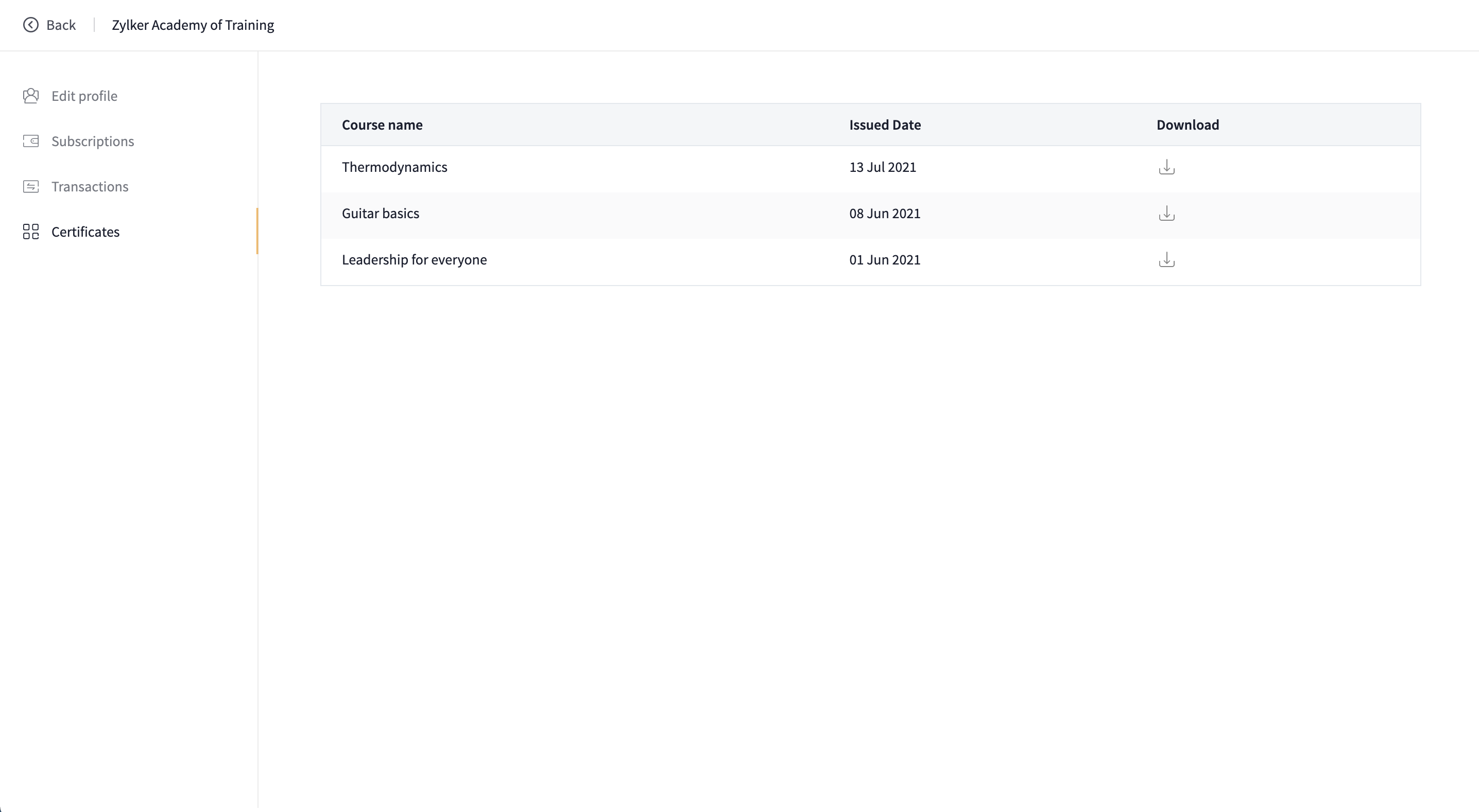 You can download all your course certificates under the certificate tab in your profile. Here you can see all the courses and workshops you've successfully completed and also the corresponding certificates that are available for download.