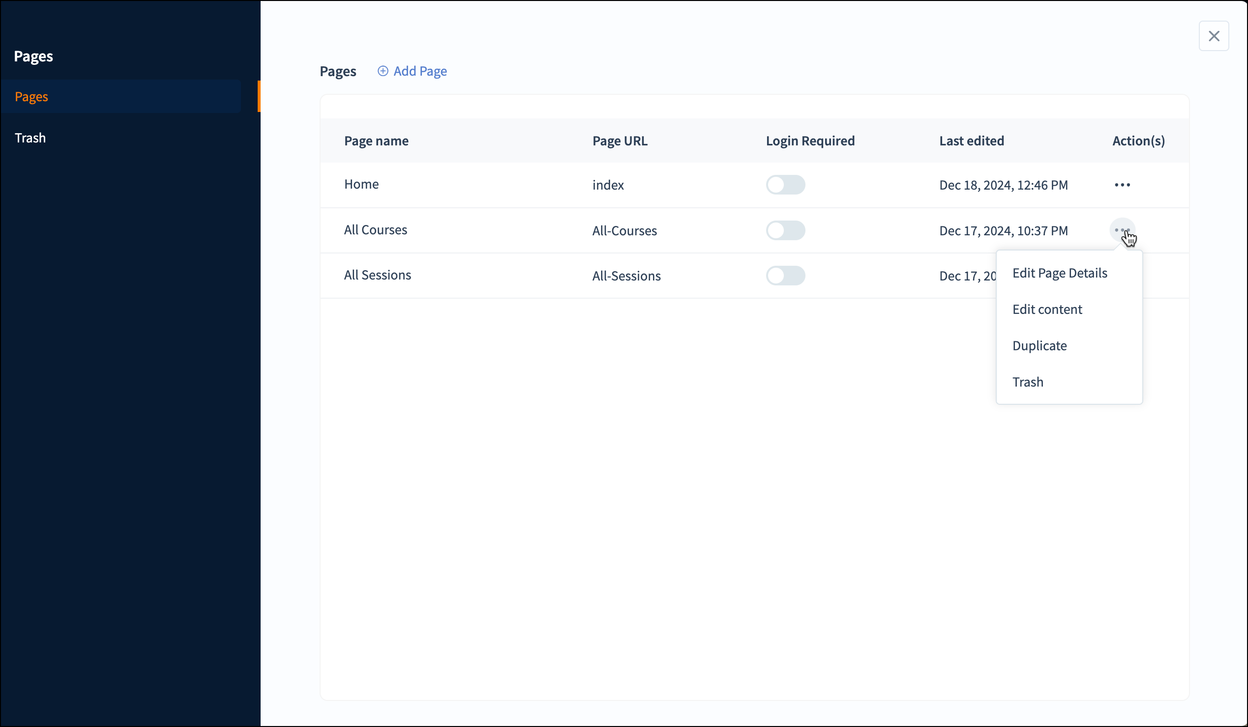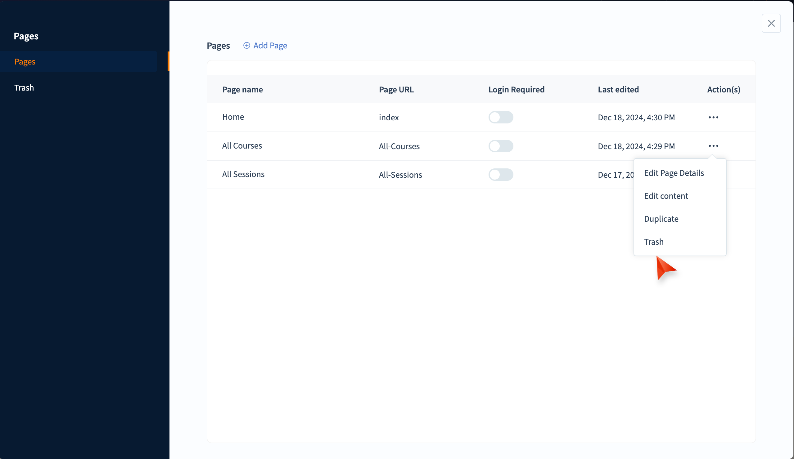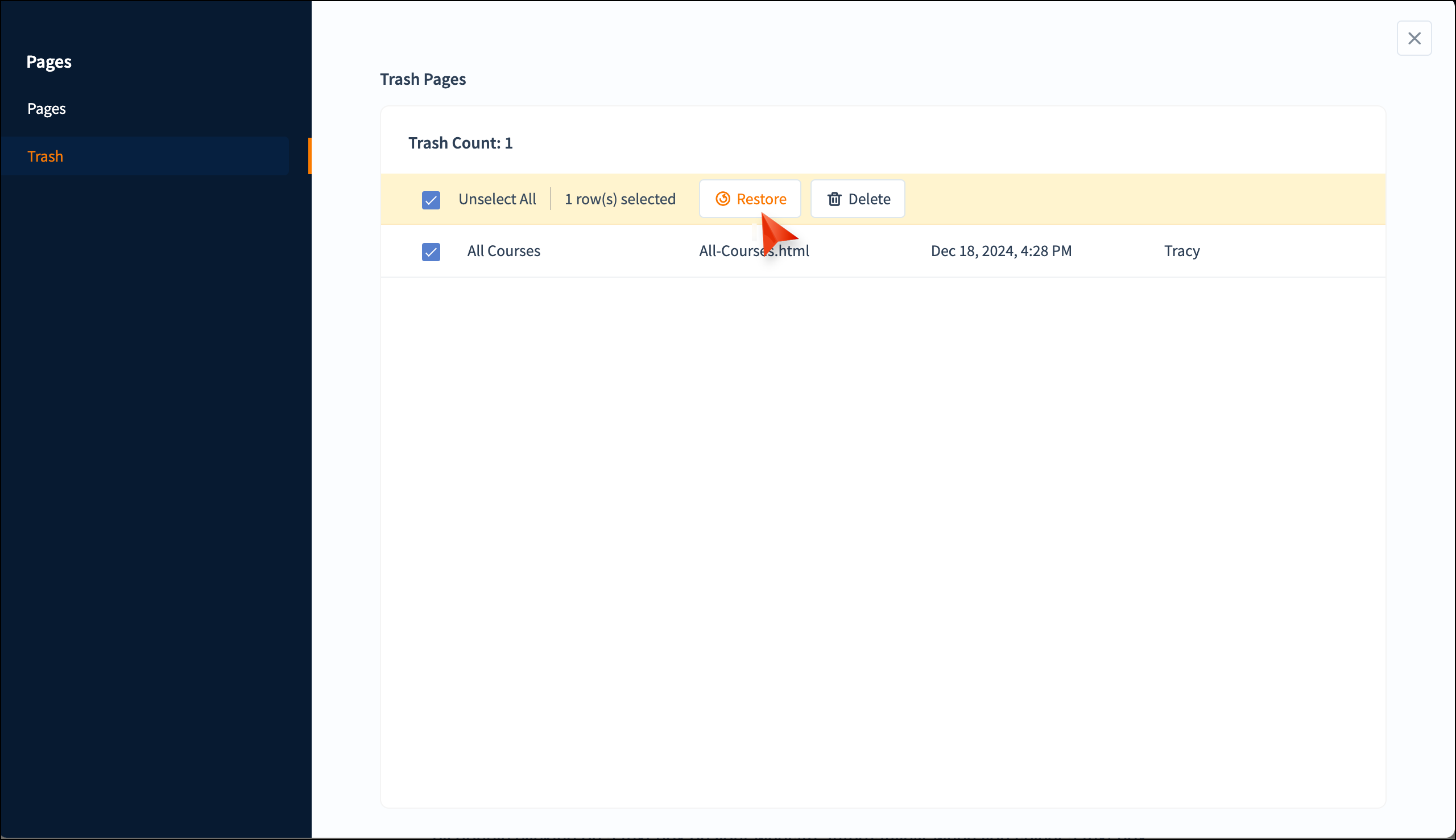 This option allows you to remove unwanted web pages from the website. It will be moved to Trash Pages, where you can restore or delete them as needed.