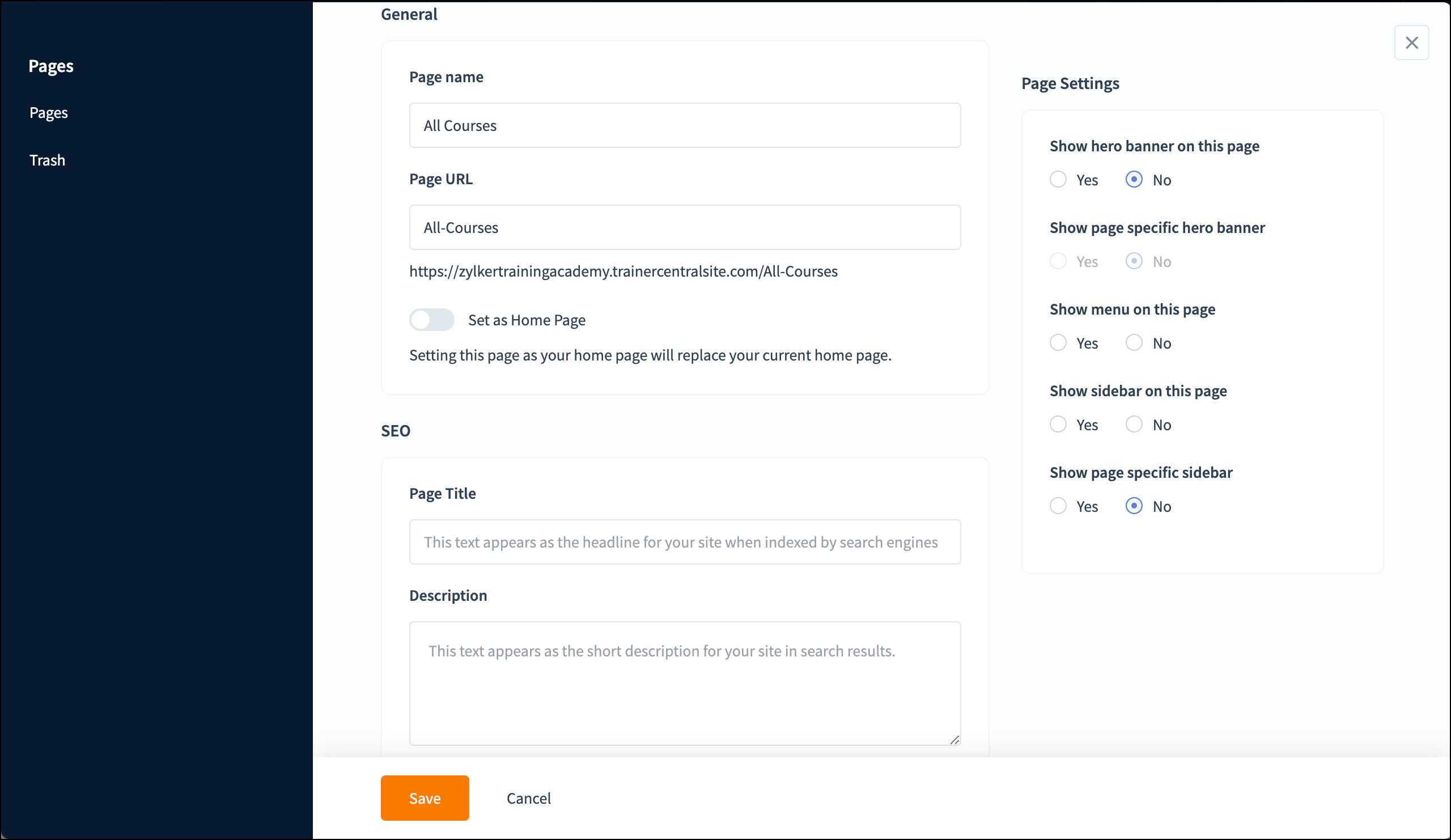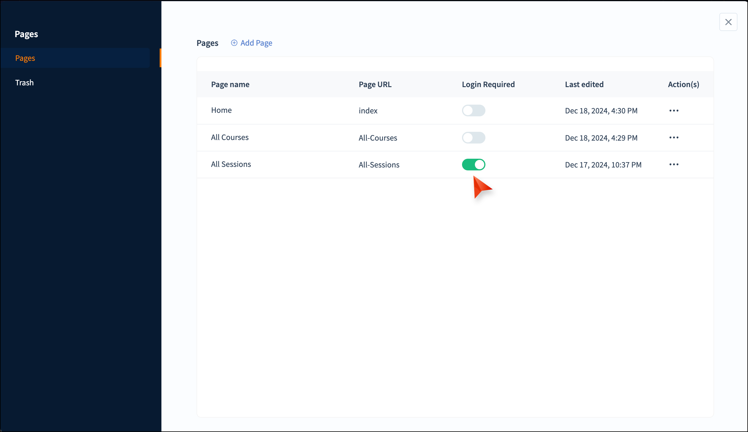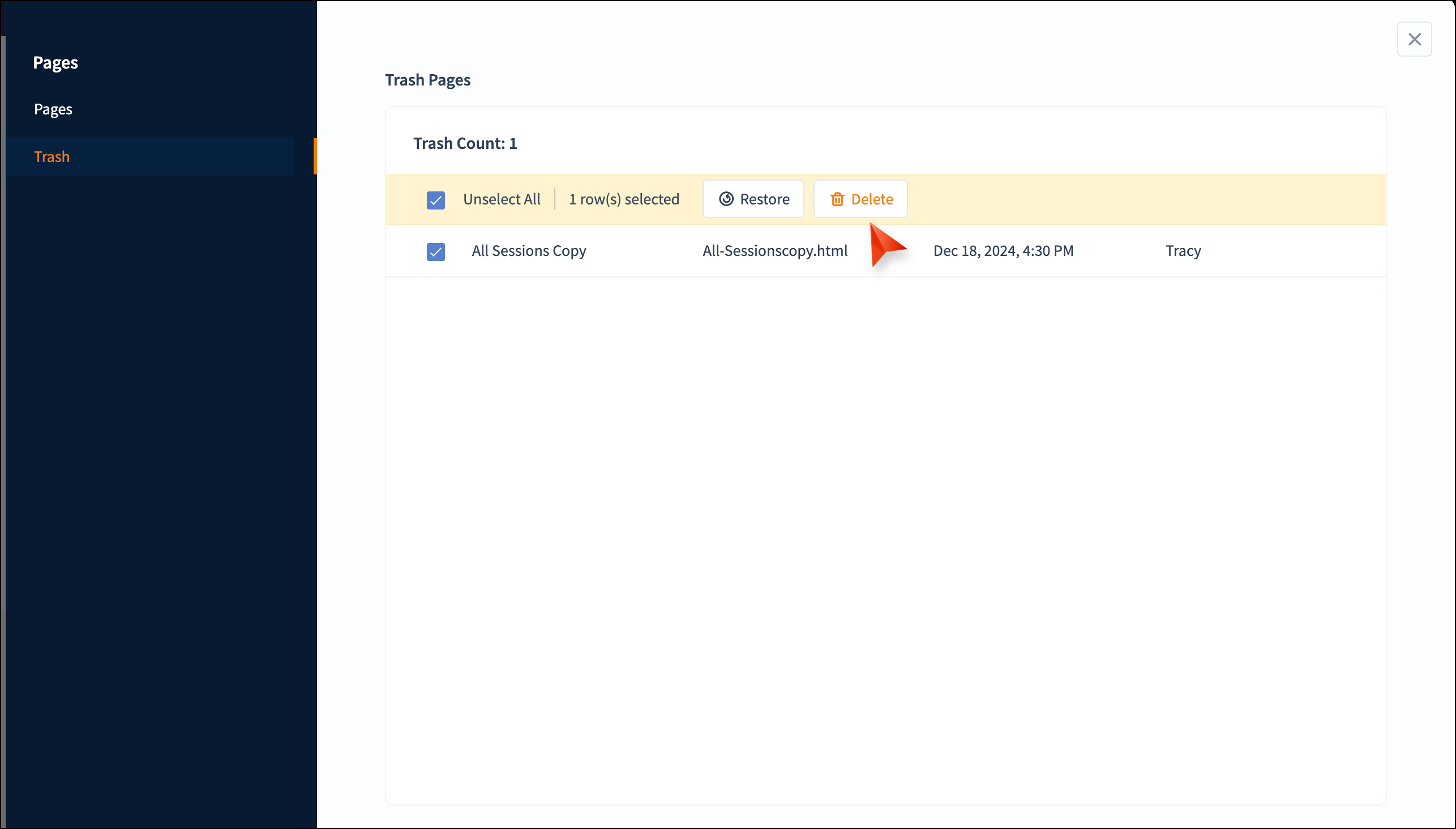 This option allows you to remove unwanted web pages from the website. It will be moved to Trash Pages, where you can restore or delete them as needed.