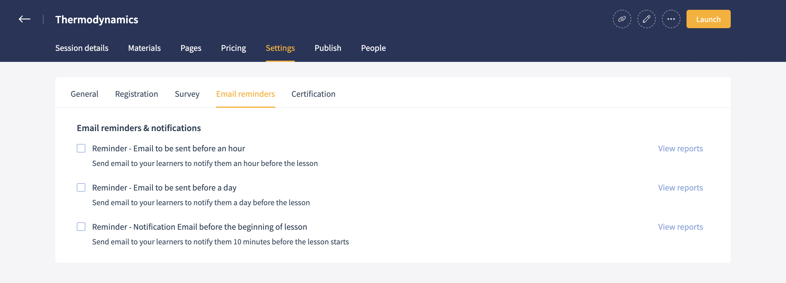 Once you configure a session, navigate to Email reminders under the Settings tab to set these reminders.