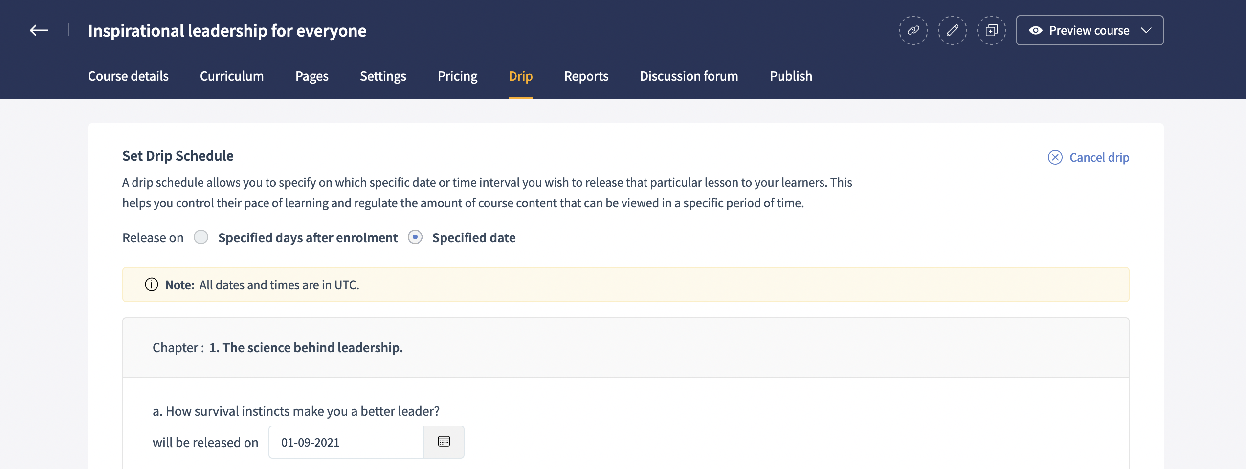 You can change the date that you've set for a Drip lesson to release it before it's specified date or you can even cancel the schedule if you wish to release all lessons to your learners.