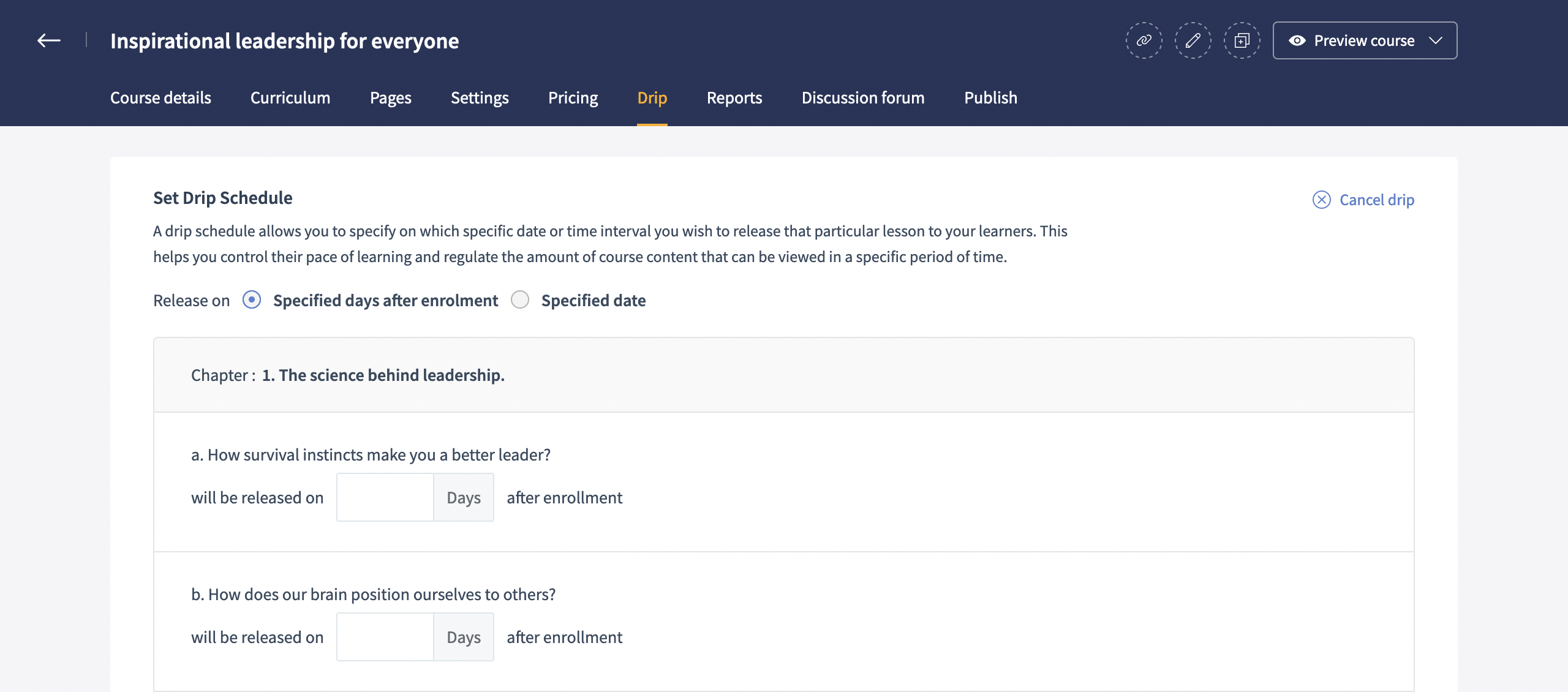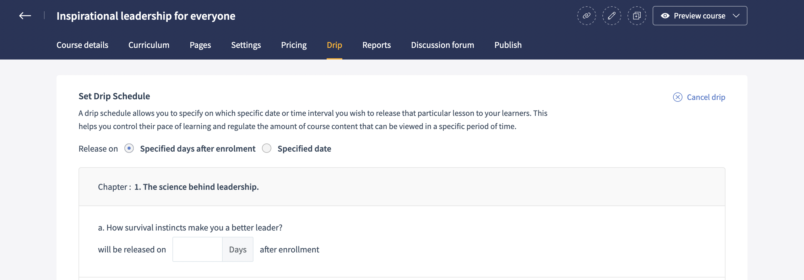 You can release a lesson based on when a learner has joined, like releasing a particular lesson 5 days after a learner enrolls to your course. Choose Specific days after enrollment under the Drip scheduler after which your learners will get access based on the specified schedule.