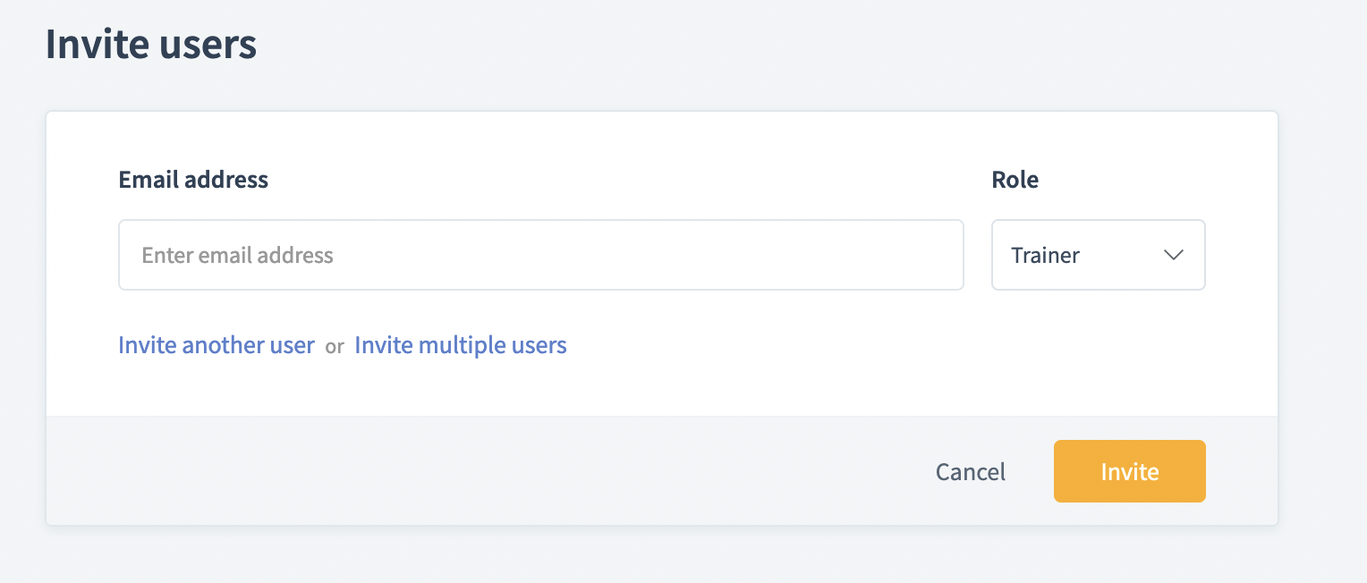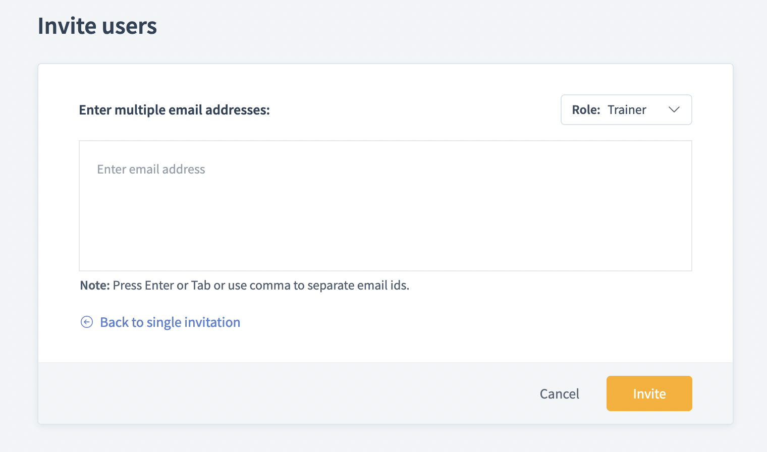 Navigate to the Users pane and click on Invite users under the Trainers tab and choose the Invite multiple trainers option. Enter multiple email addresses and click on Invite.