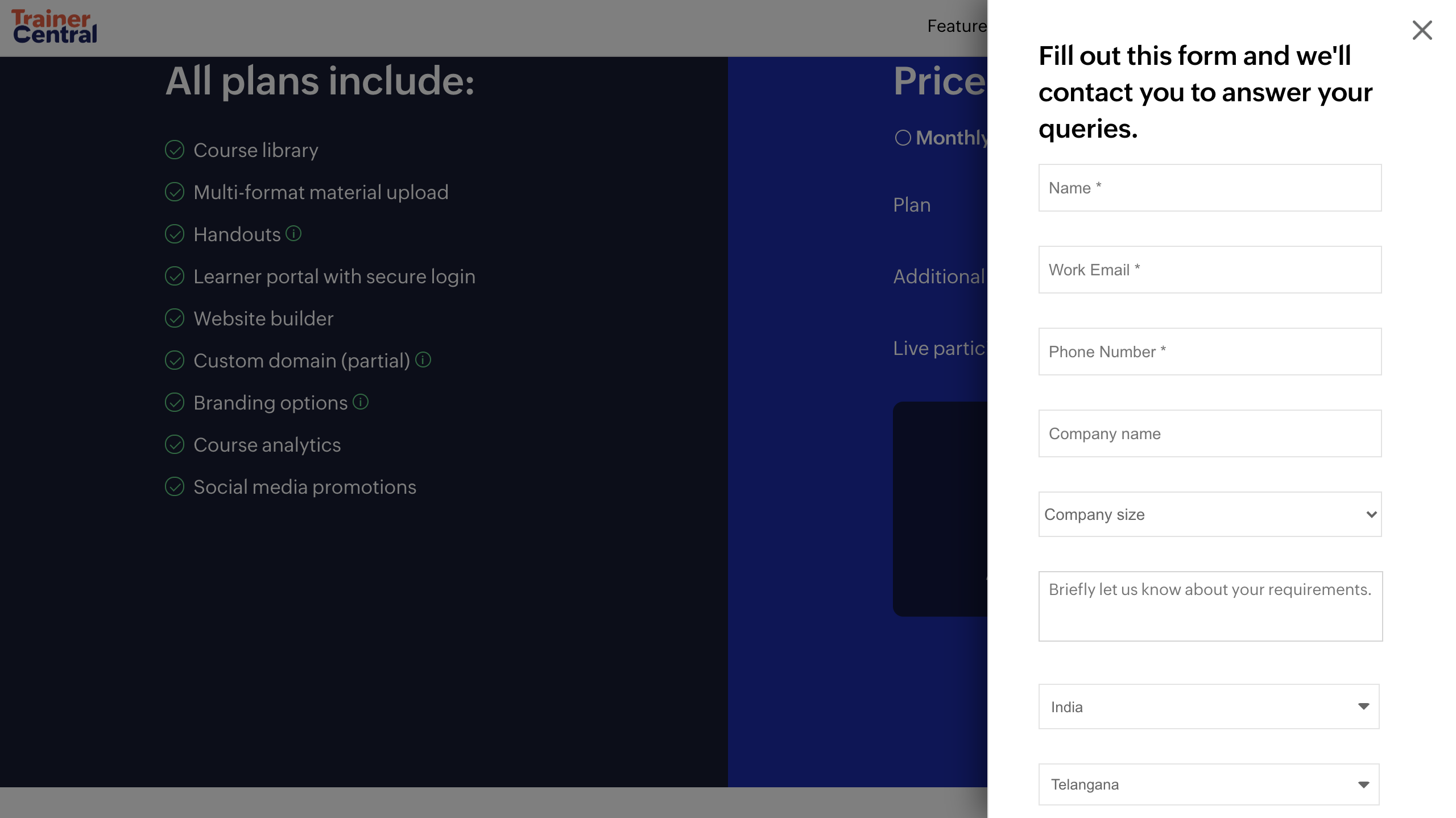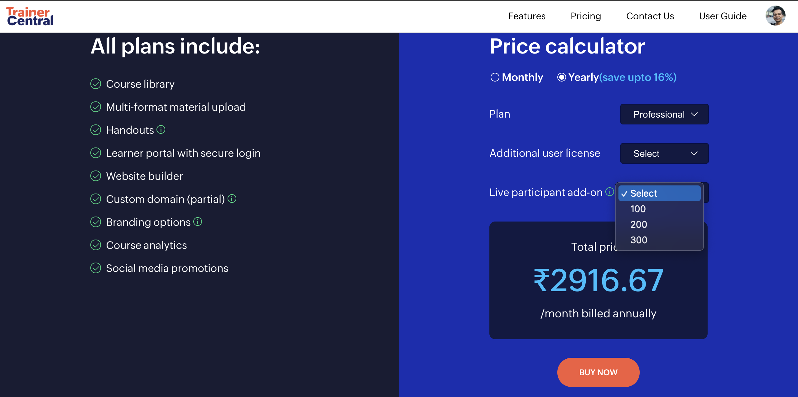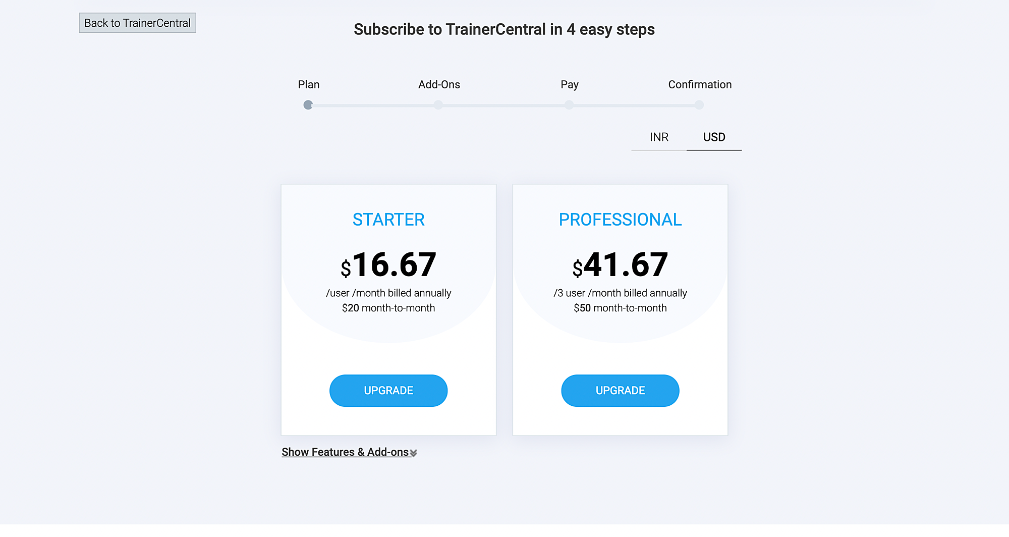 TrainerCentral offers a monthly plan and a yearly plan. If you’re using TrainerCentral on a trial or if you're on a free plan and would like to upgrade to a paid plan, follow the steps below: