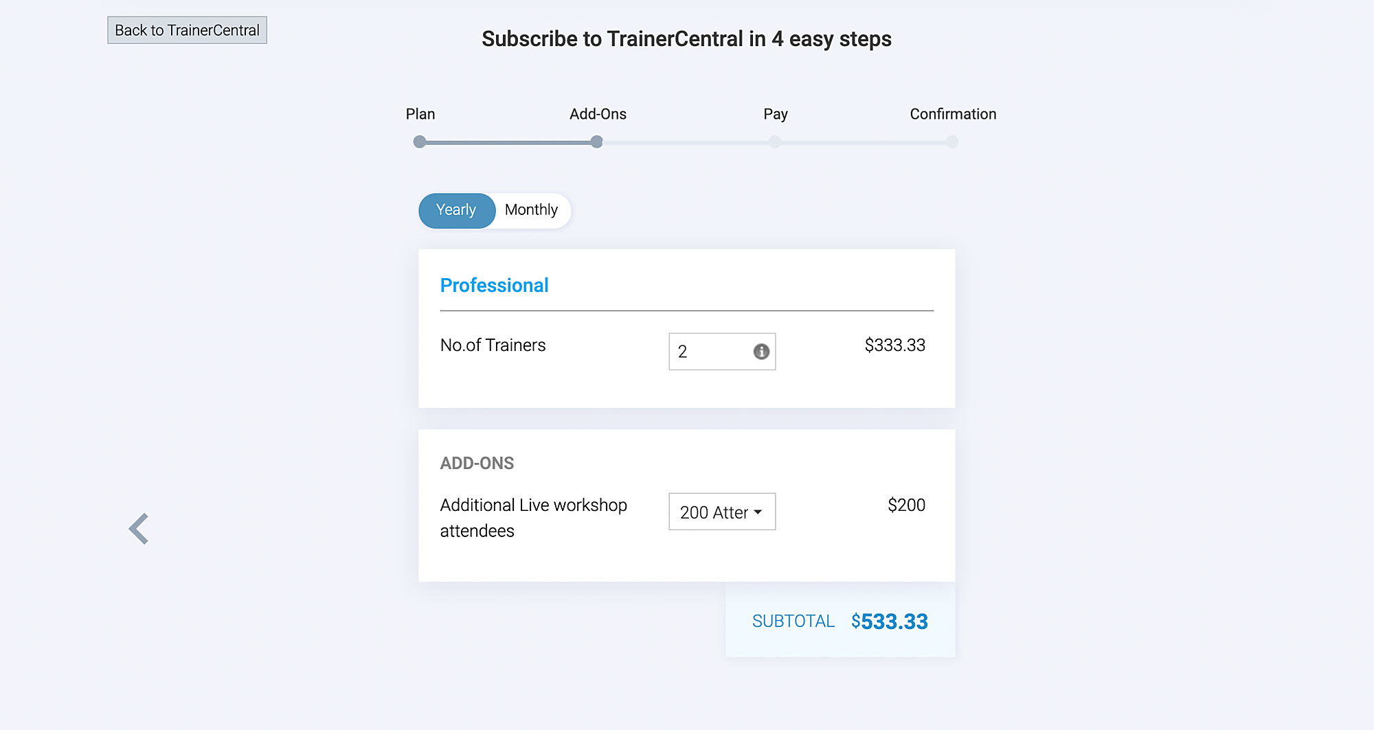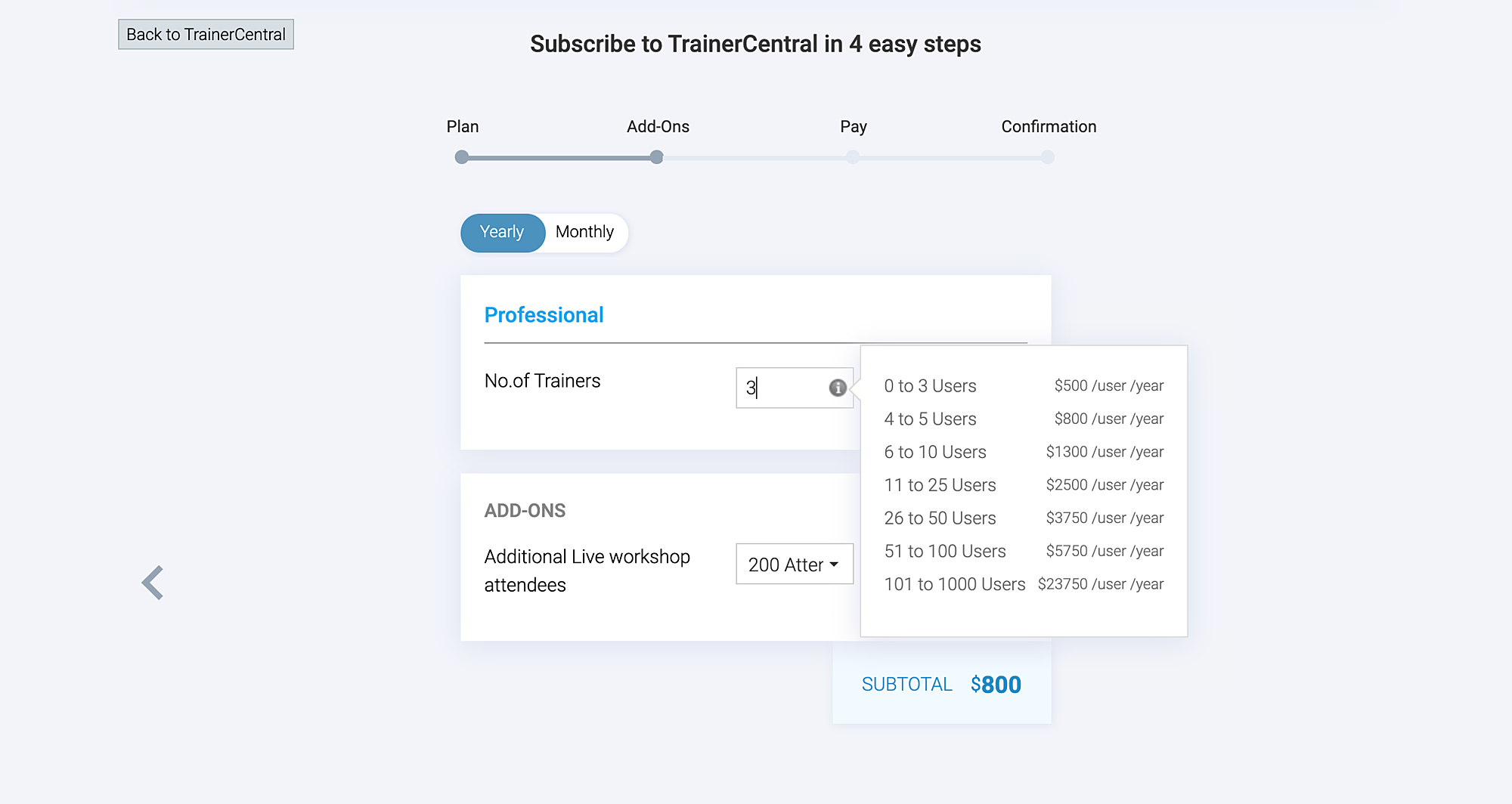 Choose the number of trainers and live workshop attendees you wish to have for account.