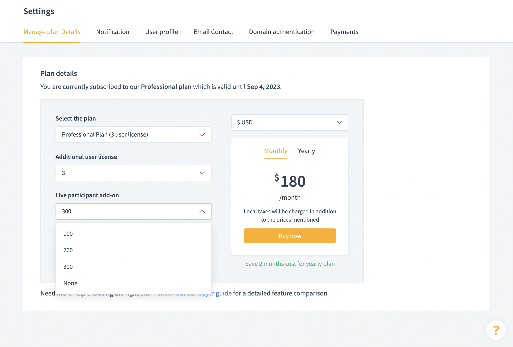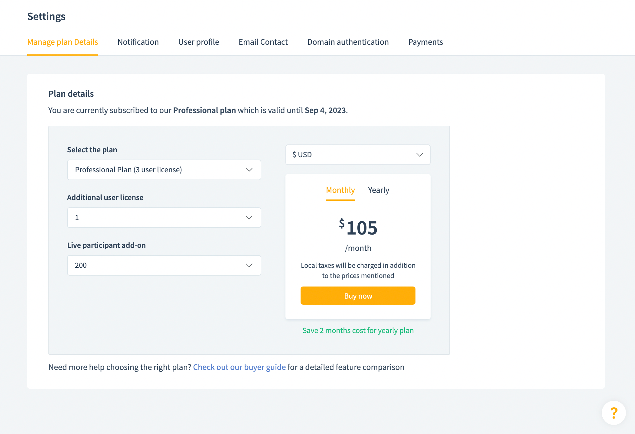 Select whether the frequency of the payment is Monthly or Yearly. The selected plan and the amount charged for the plan will load.