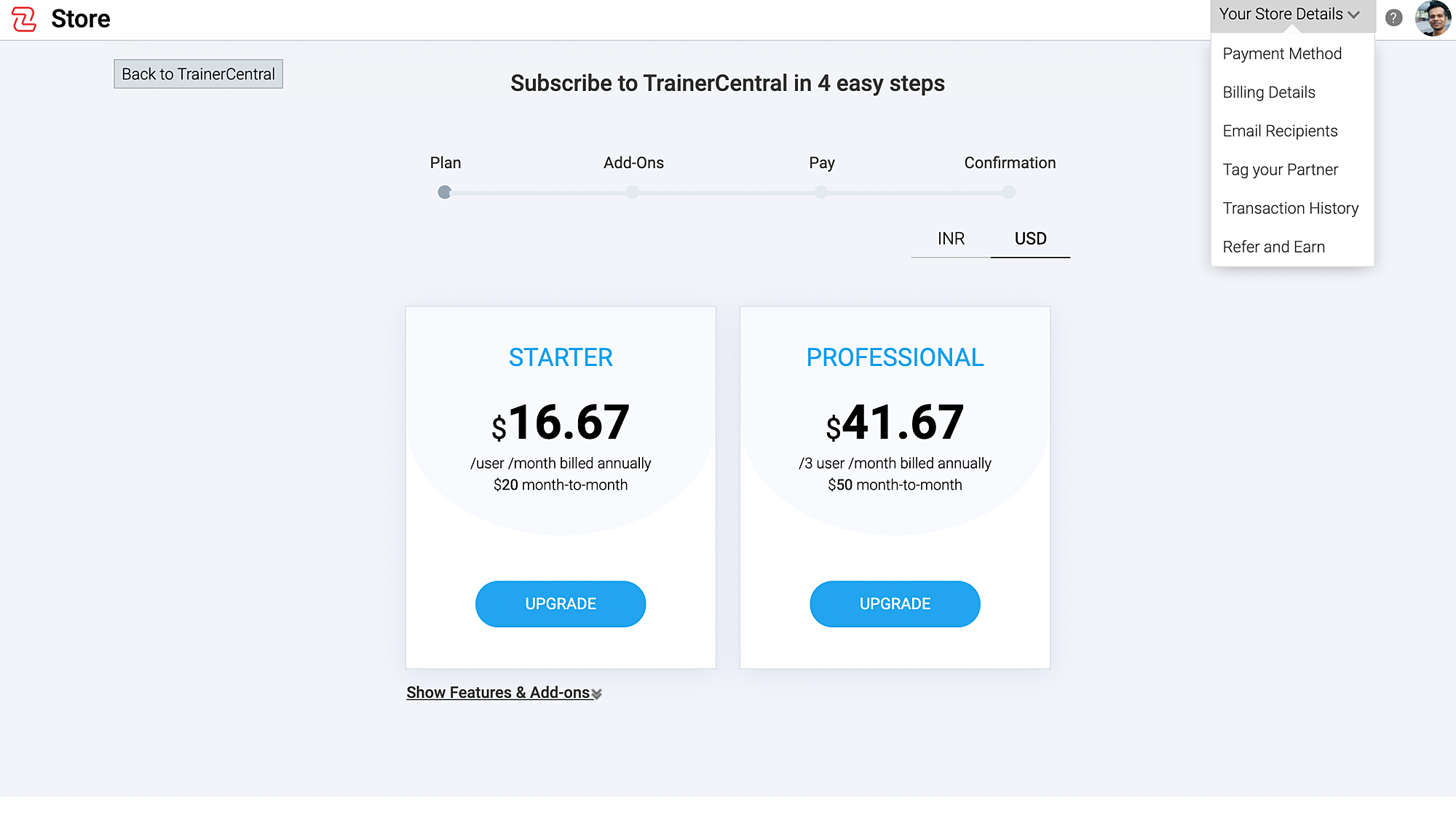 Click on Your Store Details and choose Transactions in the top-right corner to see all the records associated with your TrainerCentral subscription.