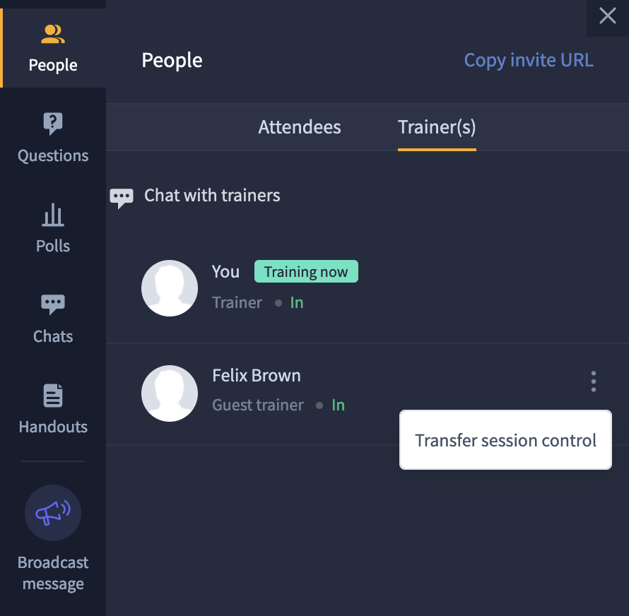 To give a guest trainer control over a session, click the Transfer session control icon.