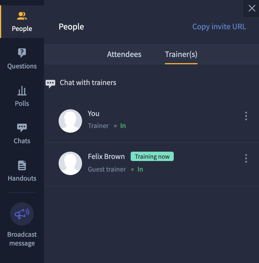 An attendee can also initiate a private chat with the trainers in a session by clicking Chat with trainers in the Chats pane.