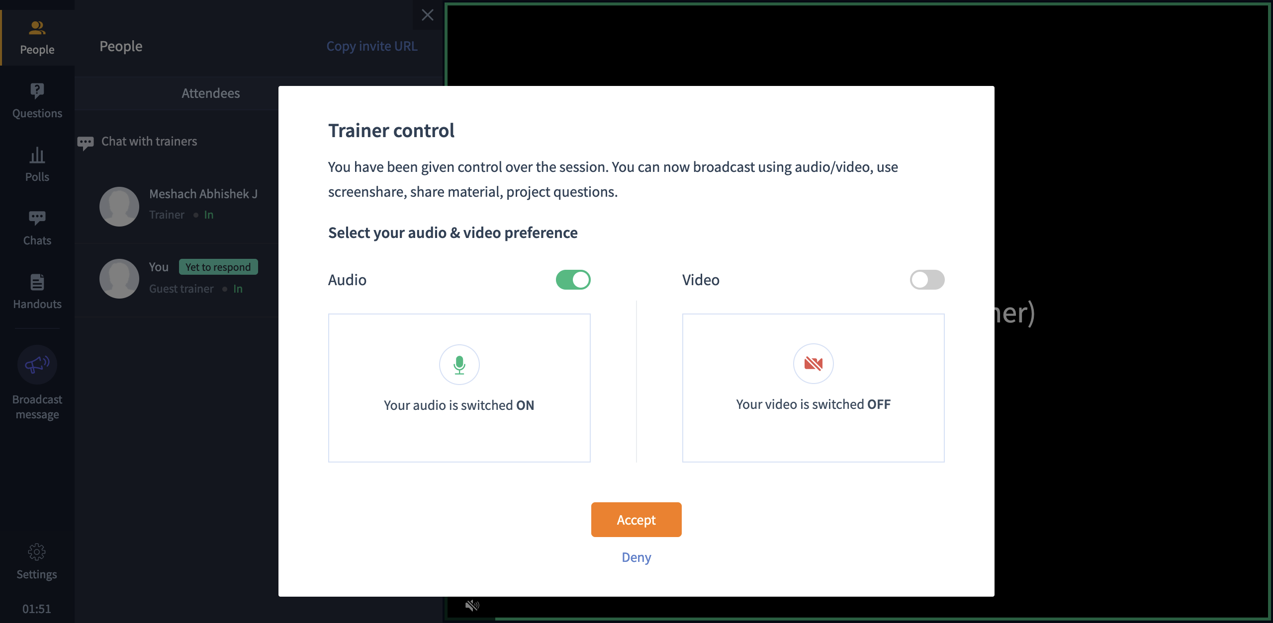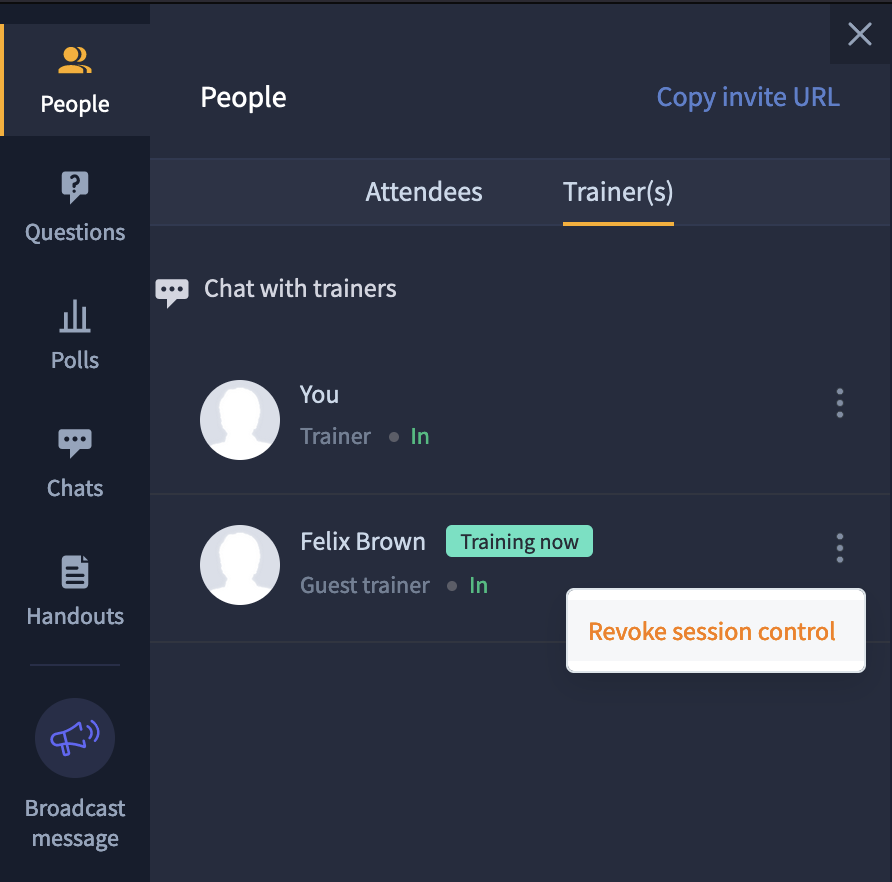 Please note that if the guest trainer refuses to take control over the session, you will automatically gain control over it, instead.