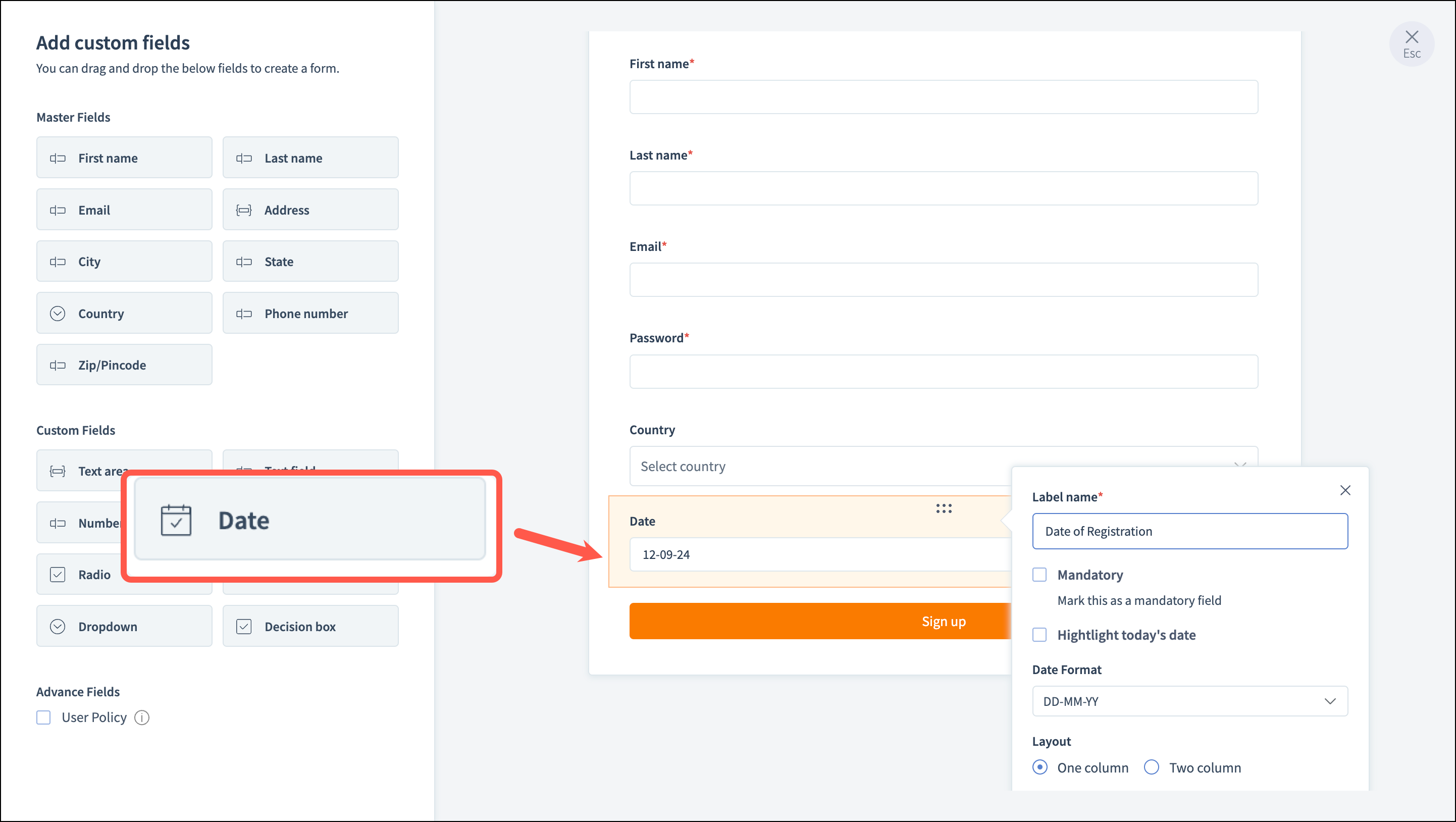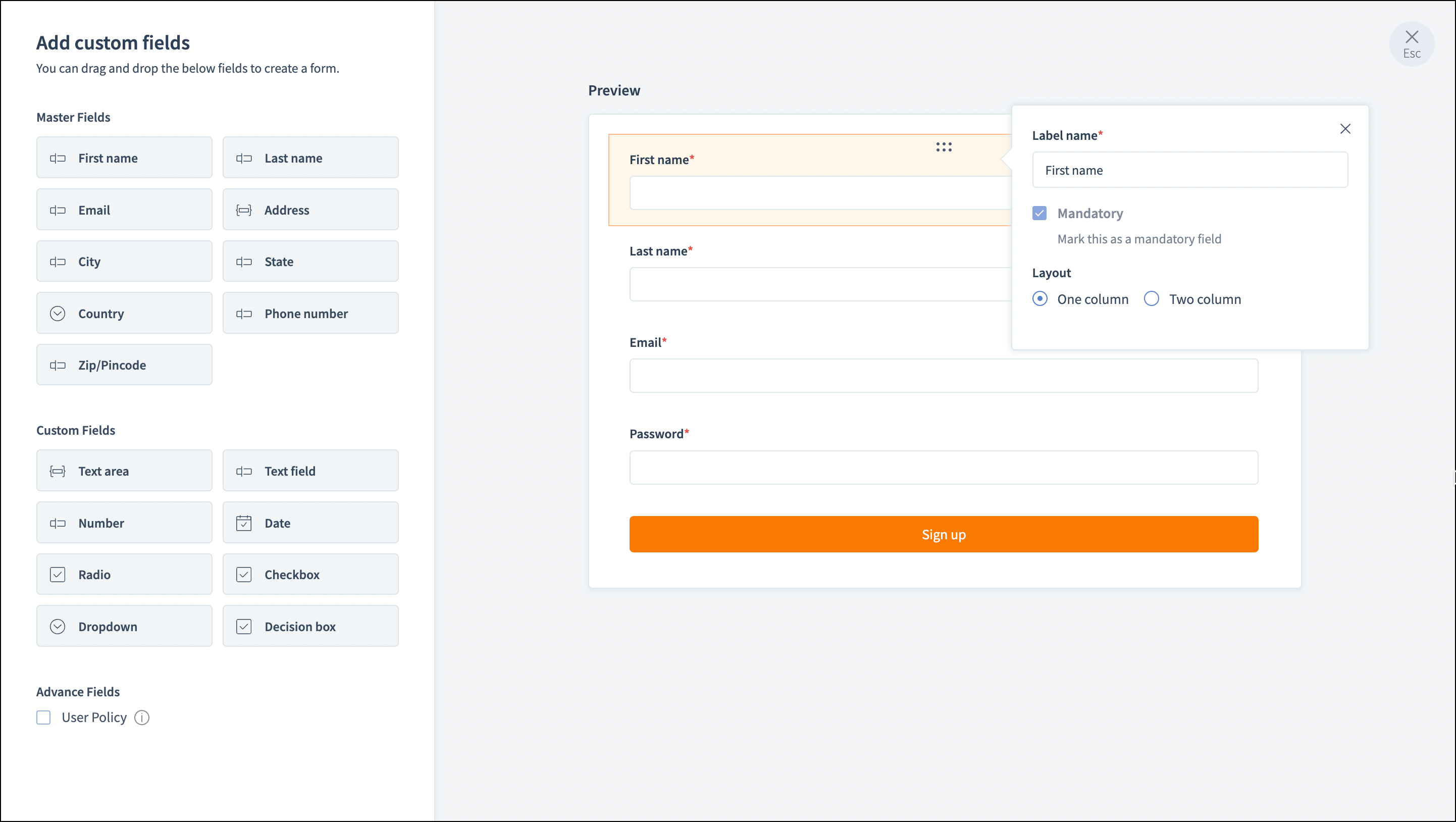 In addition to the master fields, there are custom fields that you can use to receive more information from your learners. You can create a custom field by selecting the type of information, then customizing the label and input methods.