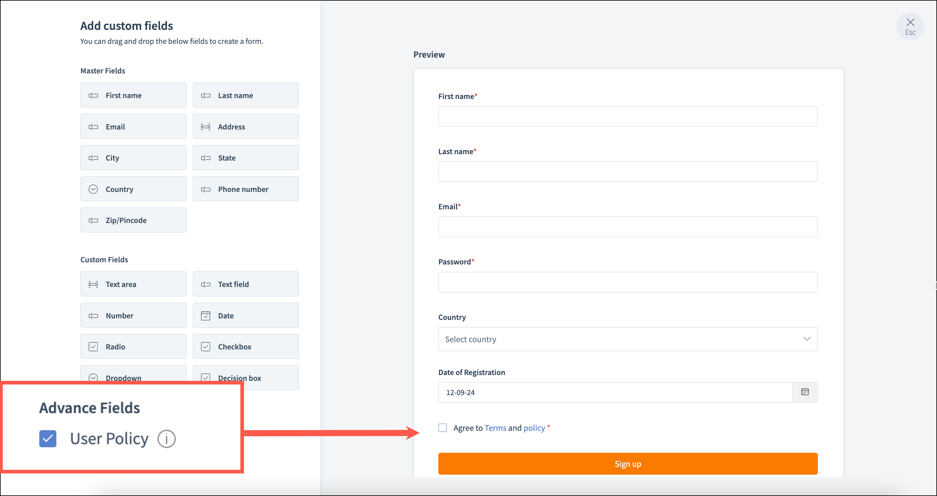 User policy can be added to your sign up form. You can add only one user policy for one form. Enable the User Policy at the bottom-left corner of the page. The user policy will be displayed on the form. You can edit the label name. To delete it, you can disable the checkbox.