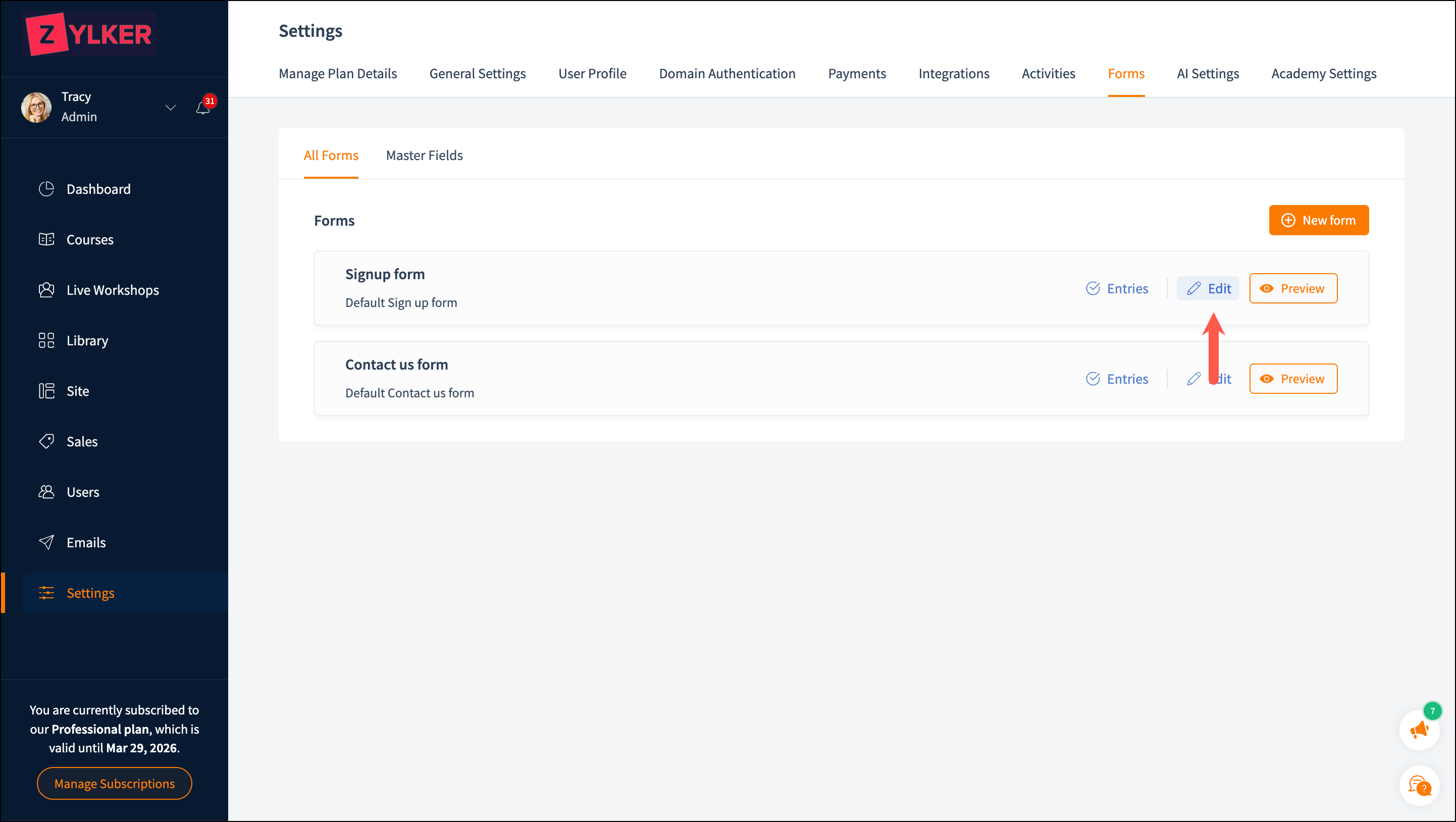 - Click the All forms tab. The default forms, such as Signup, Contact us, and other customized forms, will be displayed.