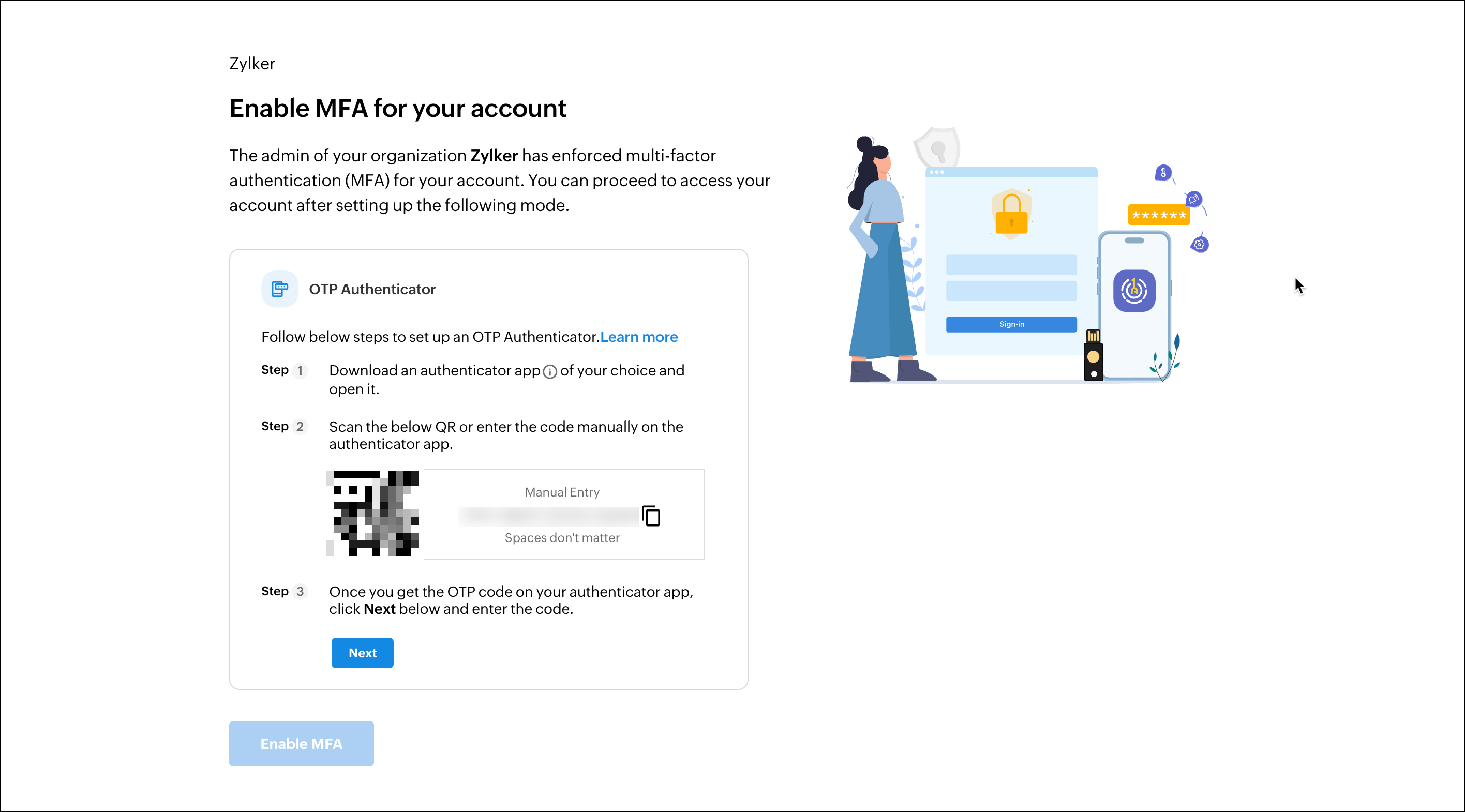 Download an OTP-authenticator such as Zoho oneAuth, Microsoft Authenticator, and Google Authenticator.
