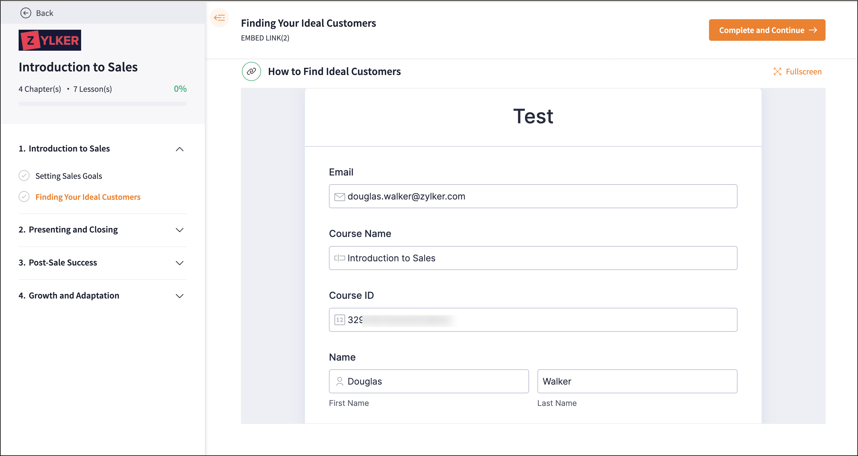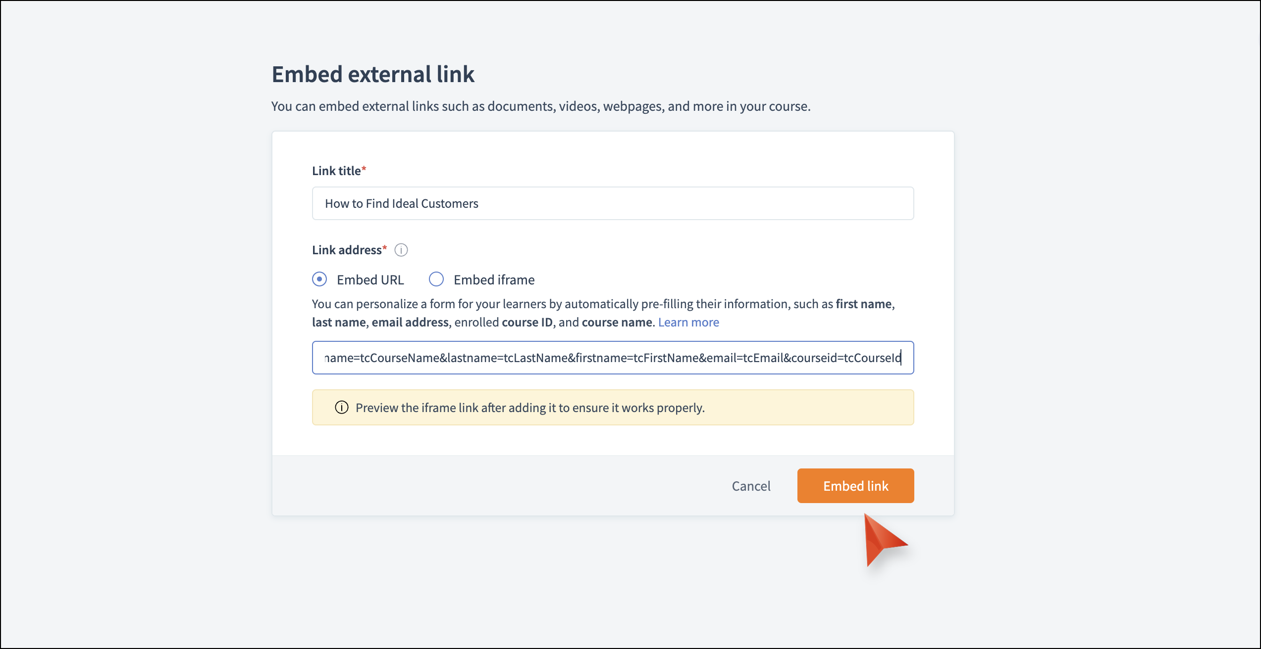 If you're embedding a survey form or worksheet for your learners to fill out, you can personalize it by prefilling in details like their first name, last name, email address, enrolled course ID, and course name. To do this, simply append the relevant parameters to the embed link or iframe URL.