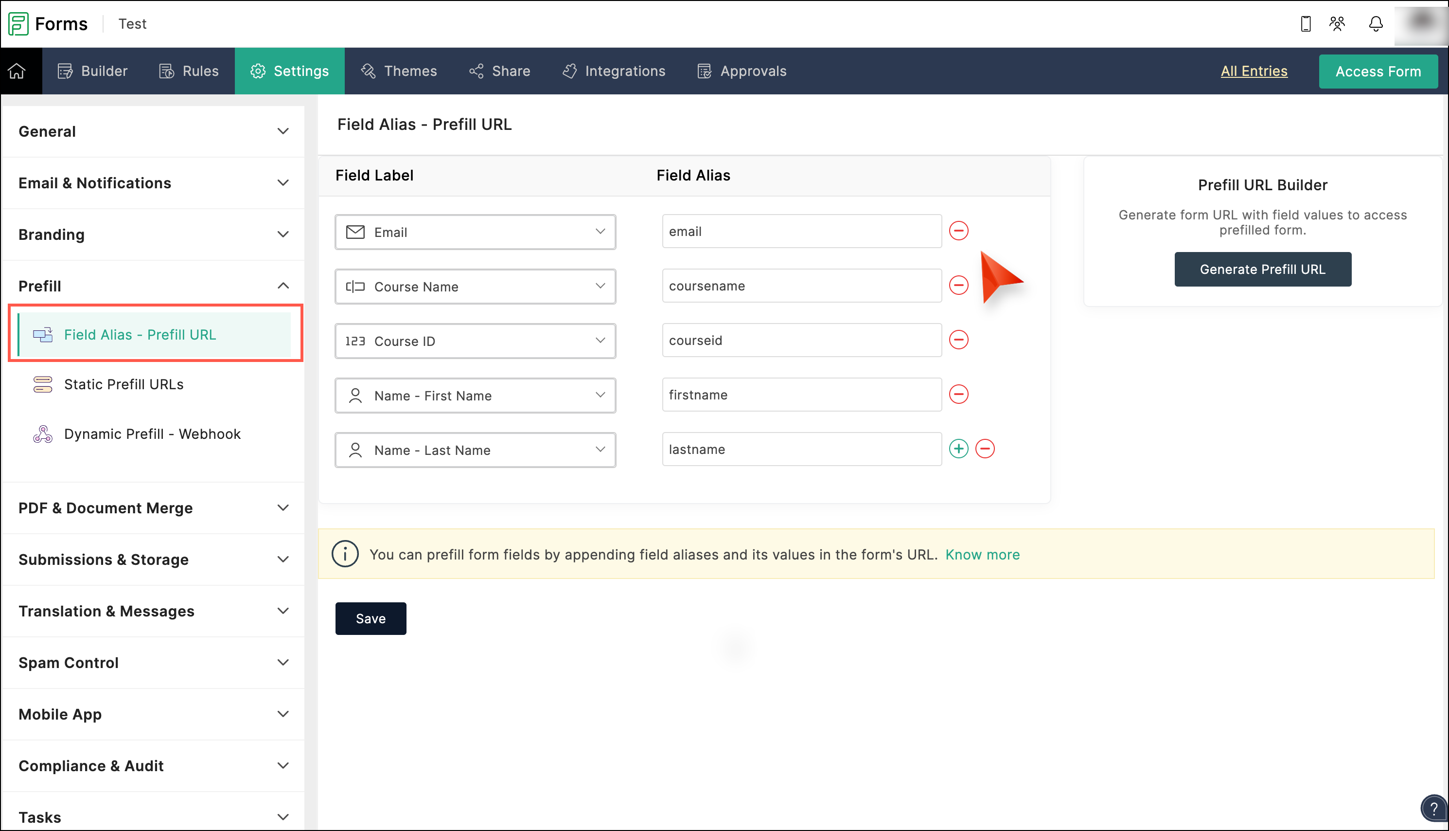 Append the copied keyword and match it with the value. For example: https://www.forms.zylker.com/forms?firstName=tcFirstName