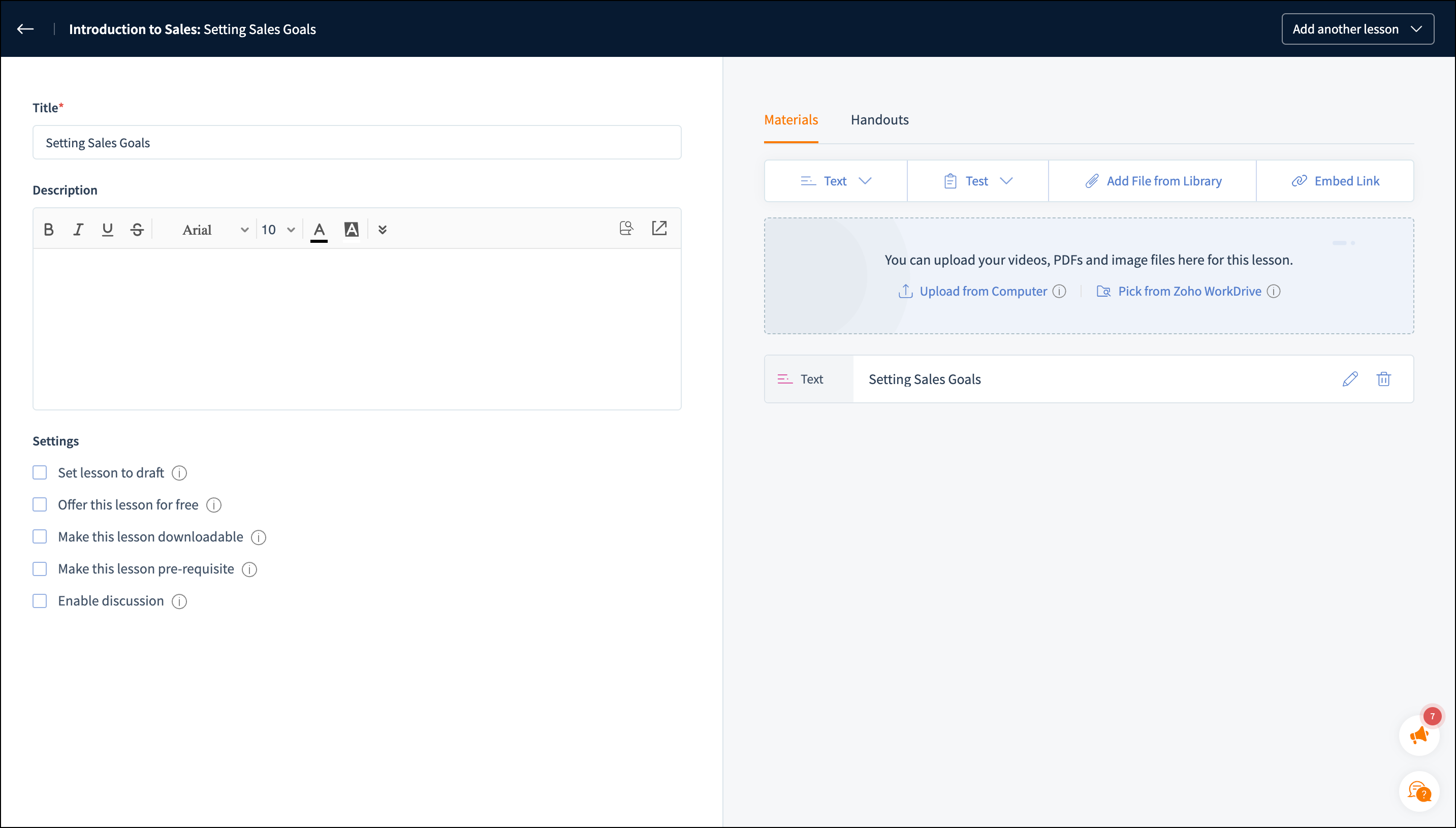 If you are unable to pick the video directly from Zoho WorkDrive, go to your WorkDrive window and play the video once, then try to pick the video from the Add lesson content window.