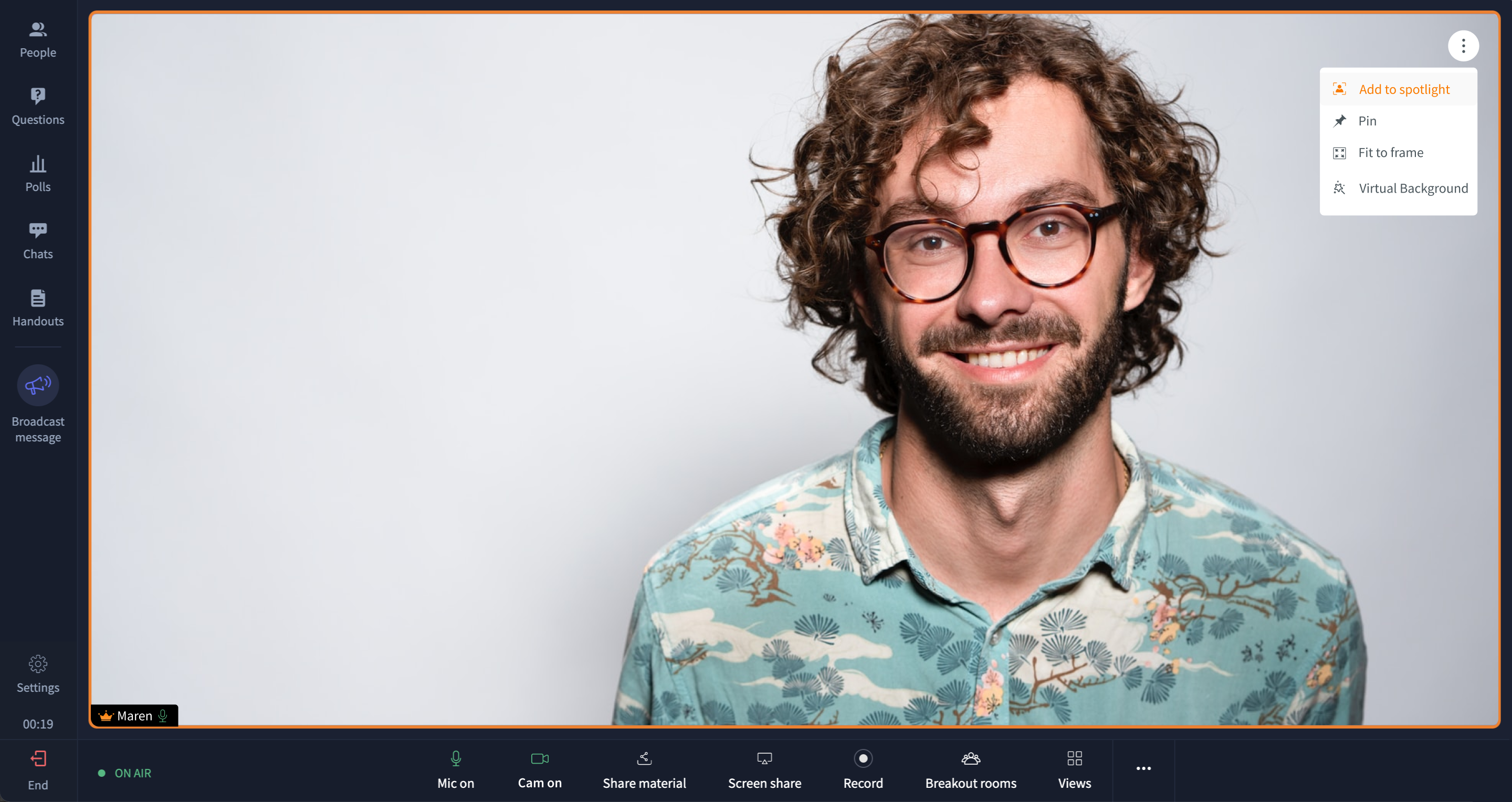 For example, when you have a panel of esteemed guest speakers, you can spotlight them so that all of them are visible at the center of the screen and they get undivided attention from all participants. Spotlighting the guest speakers helps in giving participants an experience that's close to an in-person event where all the guest speakers are on stage seated side-by-side.