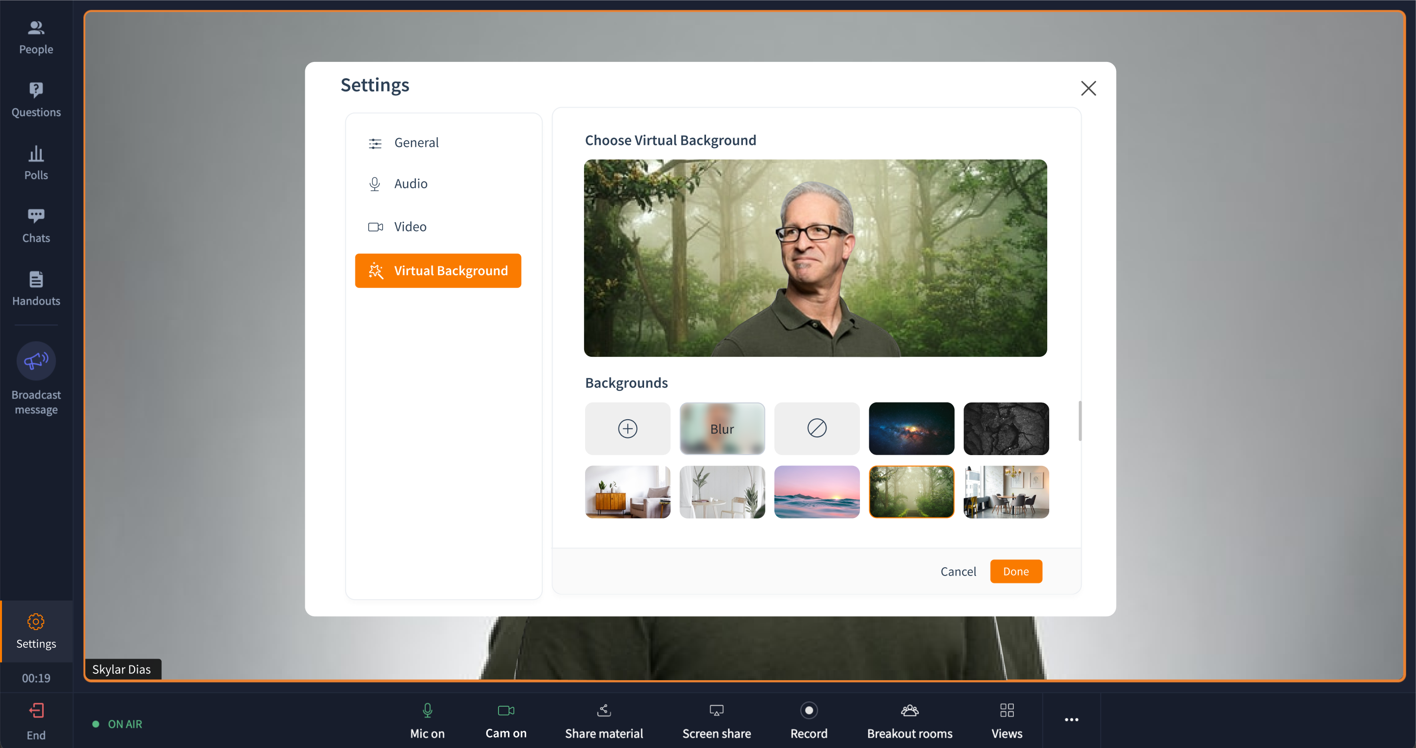Everyone in the session (trainers as well as participants) can apply virtual background filters to their video streams and mask/blur their backgrounds. To add a virtual background, simply click the Settings at the bottom left corner of your window and then click the Virtual Background section.