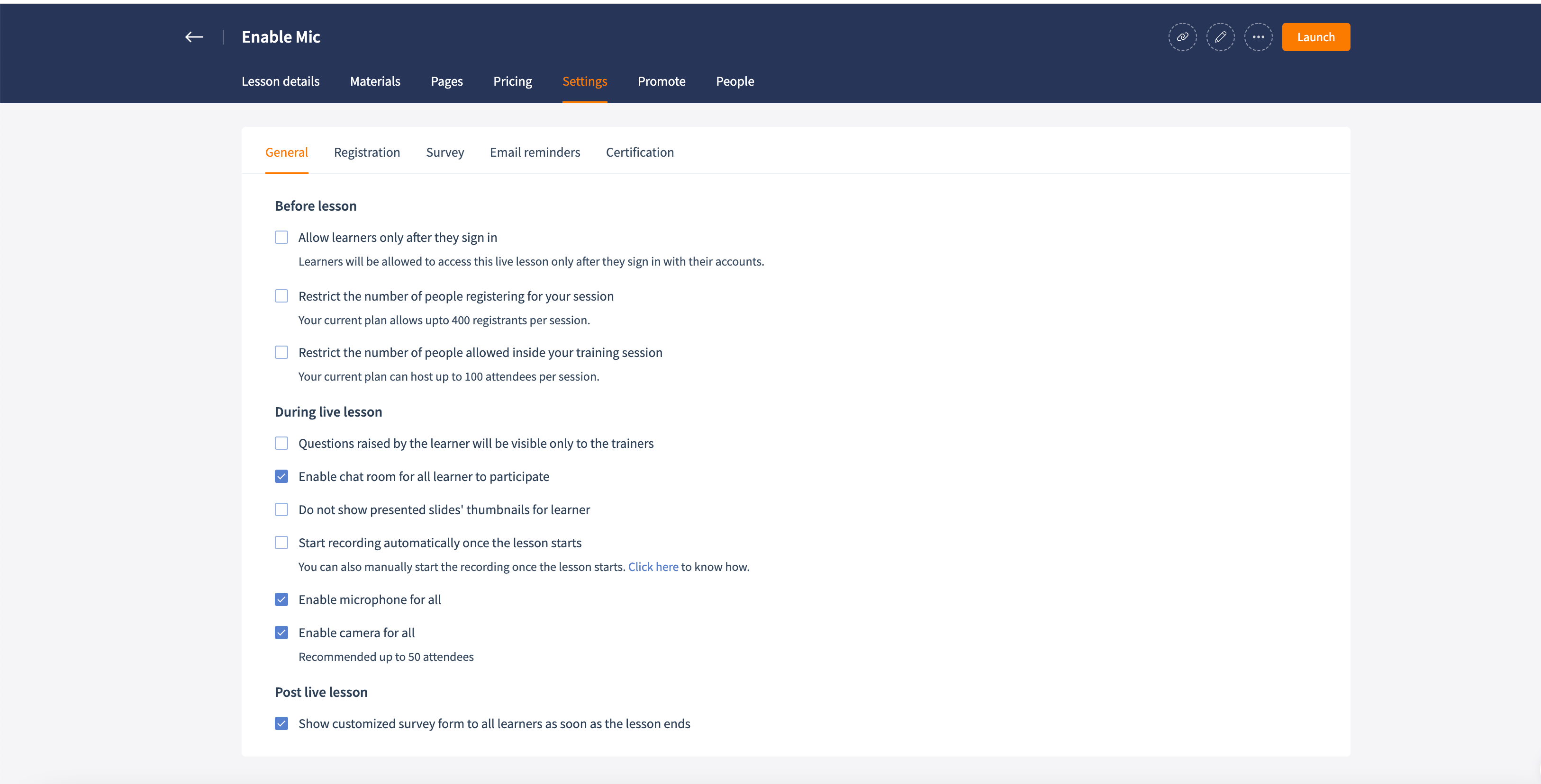 Once you have created a session, click the Settings tab. Under General, in the During live session section, you can choose to enable camera and microphone for all participants. Once enabled, you don't have to worry about granting microphone/camera to participants during the session. Each participant will have access as soon as they join the session.