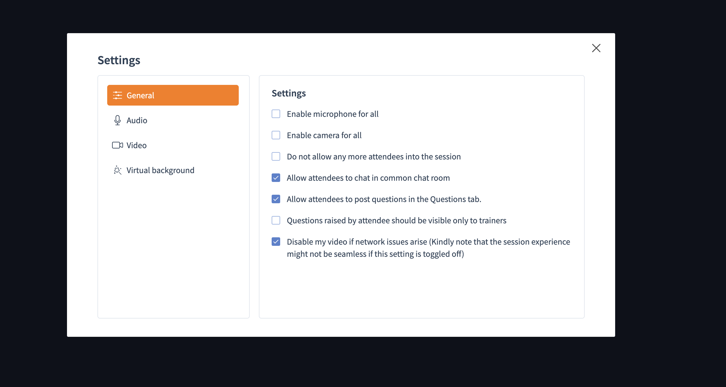 For example, as a trainer, you can keep the microphone and camera of all participants disabled in the first part of your session. Participants will have a distraction free learning experience and you, as a trainer can direct your focus towards delivering your training effectively.
