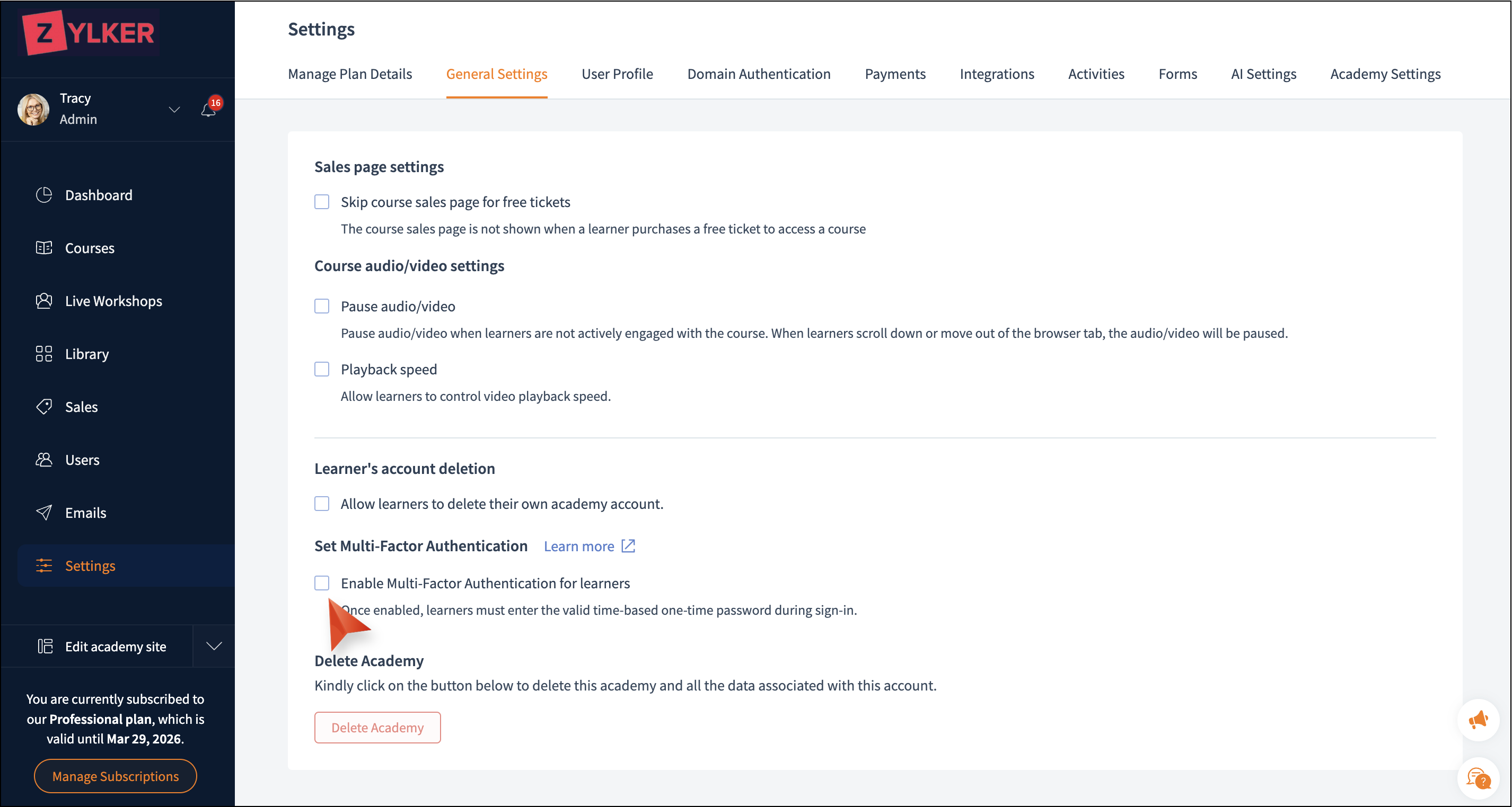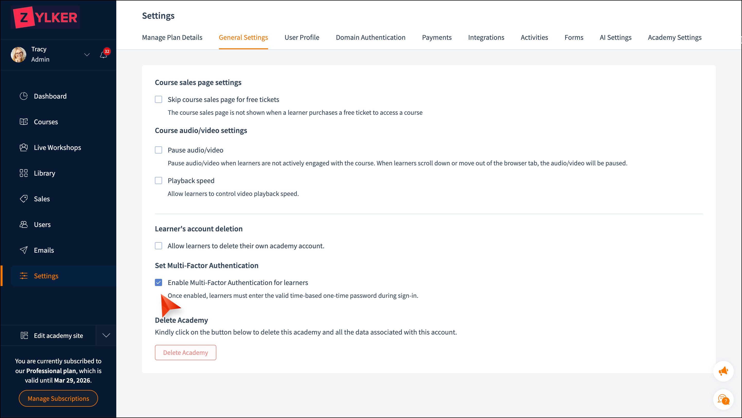 In TrainerCentral, trainers can set multi-factor authentication (MFA) for learners to access the academy. This will protect your learner's account from unauthorized access.