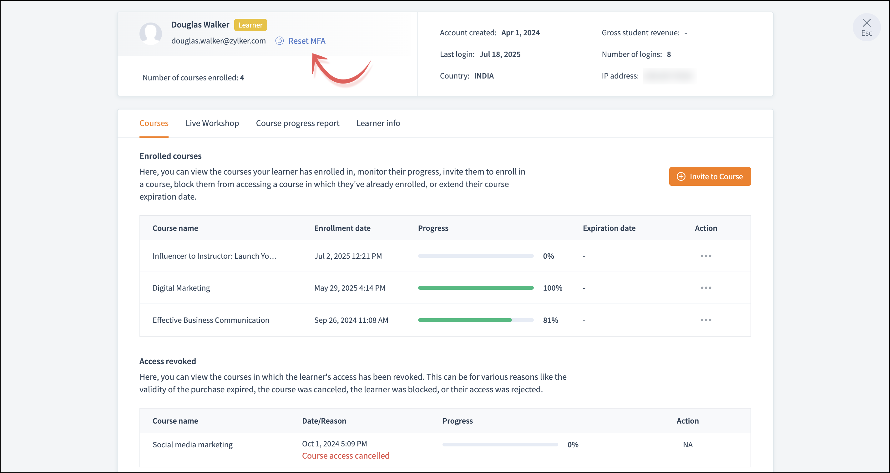 - Click the Reset MFA link in the learner profile. The learner must re-register and sign into MFA to access the account.